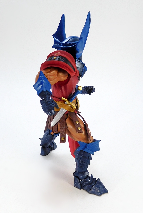 Next he comes with one of the cool little no-nonsense daggers. This one has a gold guard and pommel and the grip is painted blue to match his boots and gauntlets. There’s a loop on his main belt that he can tuck his dagger into. The loop is a little too snug to work that well with the sword, but you could probably make it fit if you really wanted to.