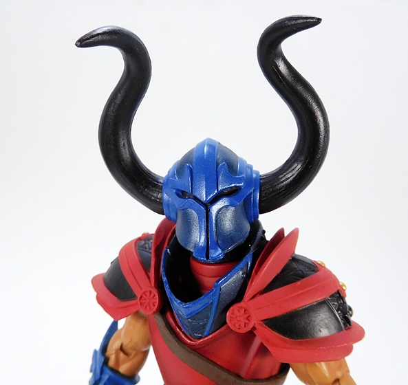 You have two display options for Raygorr’s helmet. He comes out of the package with these giant black horns, and I think they look great. And since they’re socketed into the helmet, you can even change the angles.