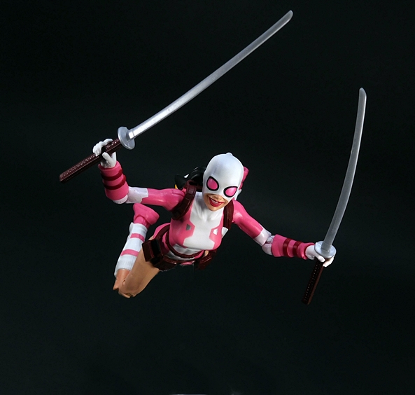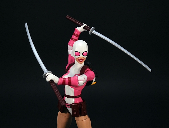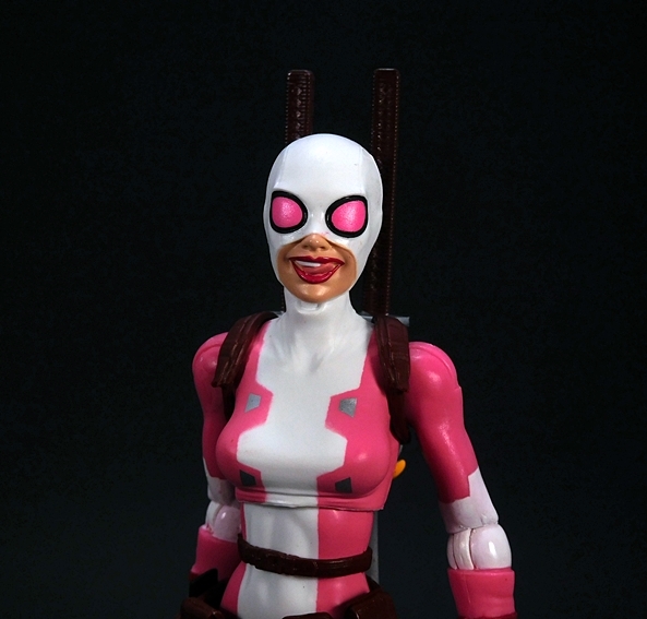 Gwenpool features two different heads. One is a regular smiling head, the other has her sticking out her tongue as if she’s licking her lips. It’s a nice extra, but to be honest, I would have much rather they included an unmasked head. I wound up having to go to Diamond Select for that look, but that’s a review for another day. Besides, I get it, this head didn’t require an entirely new sculpt and it does add plenty of personality to the figure. Both heads feature more of that pretty pink and white paint and the exposed portion of her face is nicely sculpted with some sharp paint.