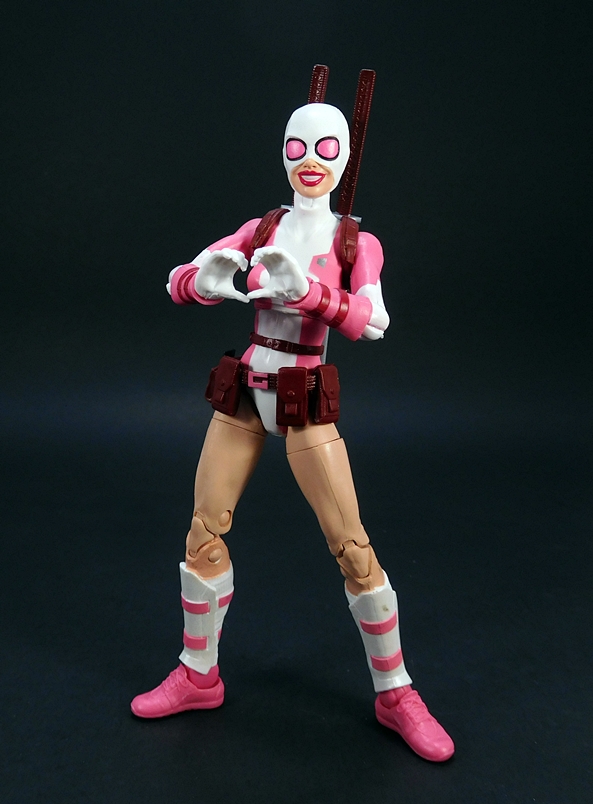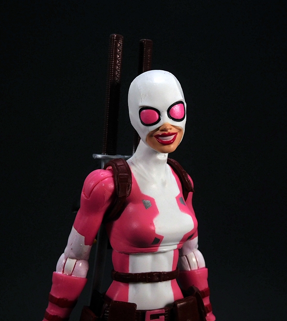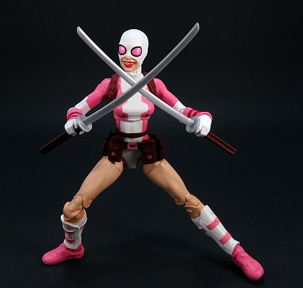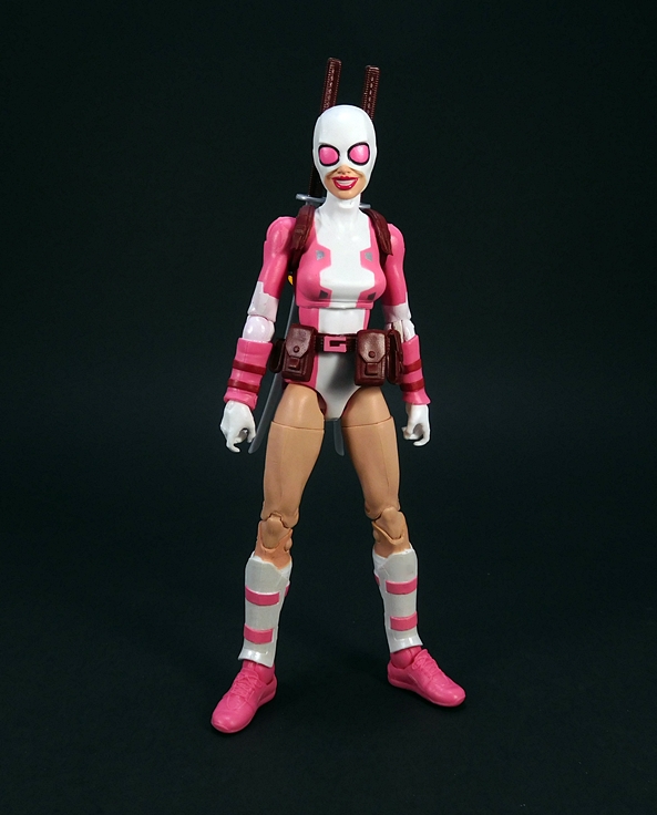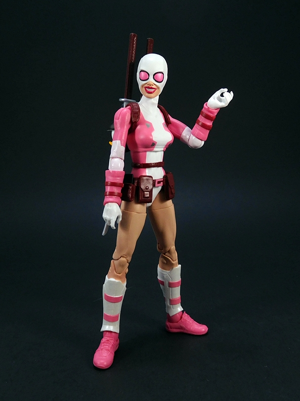 Rather than just slap a pink version of Wade’s costume, Gwenpool’s creators gave her more of a stand out look and Hasbro did a nice job bringing it to action figure form. The costume represents a decent mix of painted details with some new sculpting. Most of her long sleeved one-piece is achieved through some sharp and vibrant white and pink paint, and the white even has a cool pearlescent sheen to it in some areas. She does have newly sculpted arm bracers, as well as sneakers and shin guards over her socks. The legs are bare with an even flesh tone painted on.