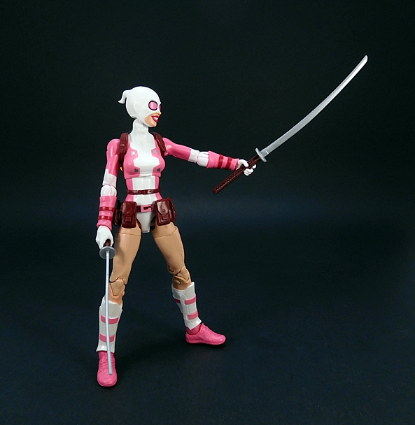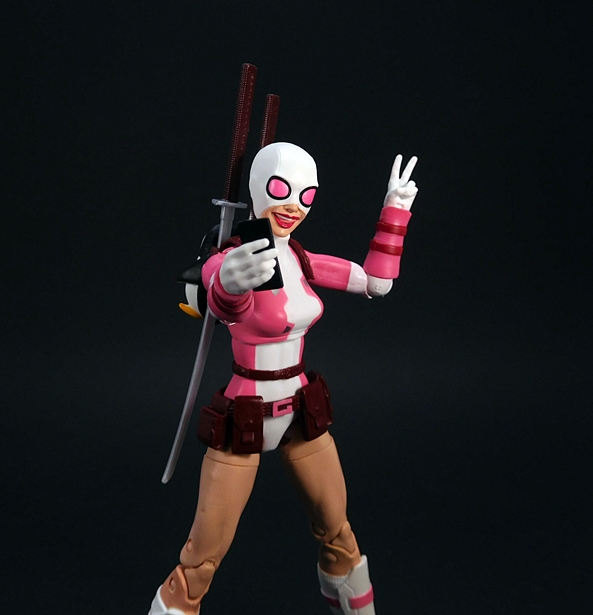 Along with the extra noggin, Gwenpool comes with three sets of hands, and two of these pairs are very specific. In addition to the katana holding hands, she has a pair so she can make a heart shape with her fingers. The third pair consists of her left hand holding up a two-finger peace symbol, and one to hold her cellphone. The cell phone is a simple black slab of plastic. I’m tempted to say they should have just sculpted it as part of the hand, but then you couldn’t keep it in the nifty spot they provided on her belt. The extra hands are fun and they certainly suit the character, but don’t even get me started on Marvel and their annoying habit of having all their goddamn characters snapping selfie’s all the time. It’s almost as trite as the recap pages using Tweets or social media posts in books like Squirrel-Girl, or using a Youtube show as the basis for an ongoing plot in She-Hulk.