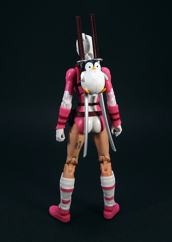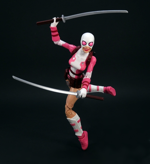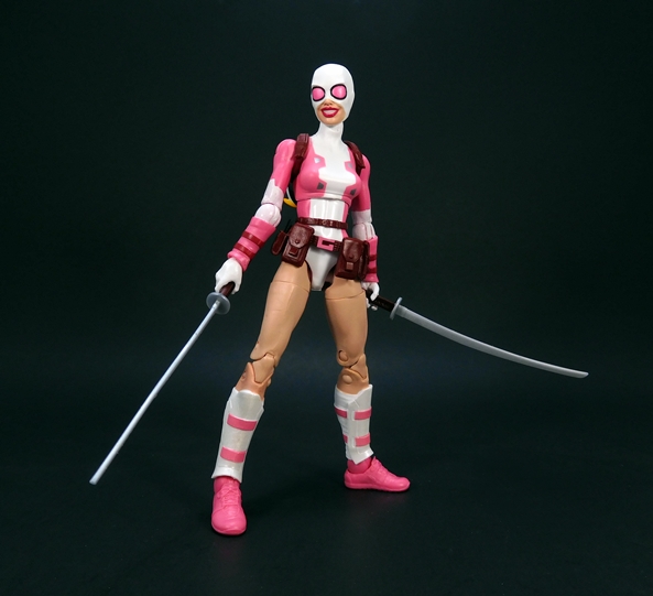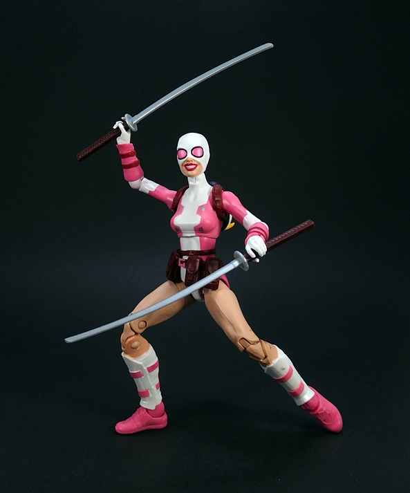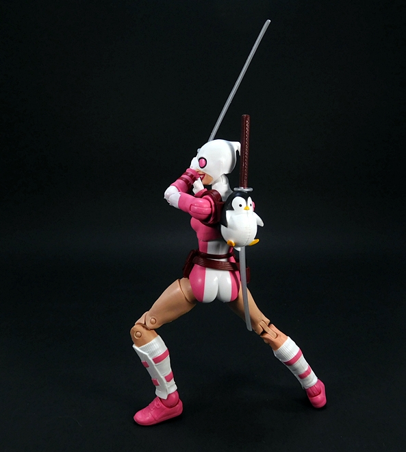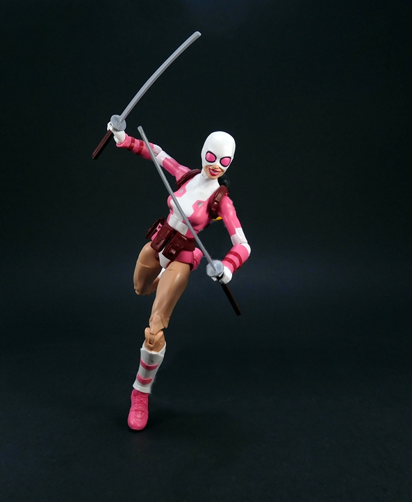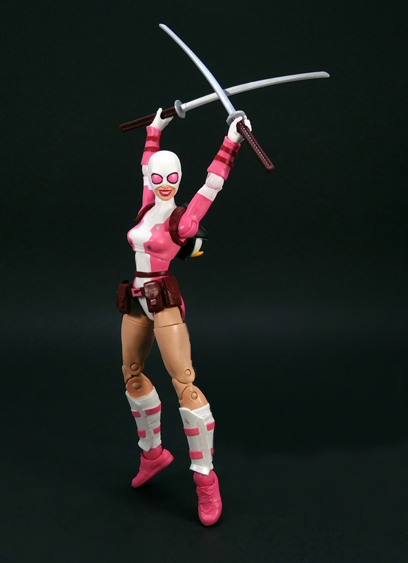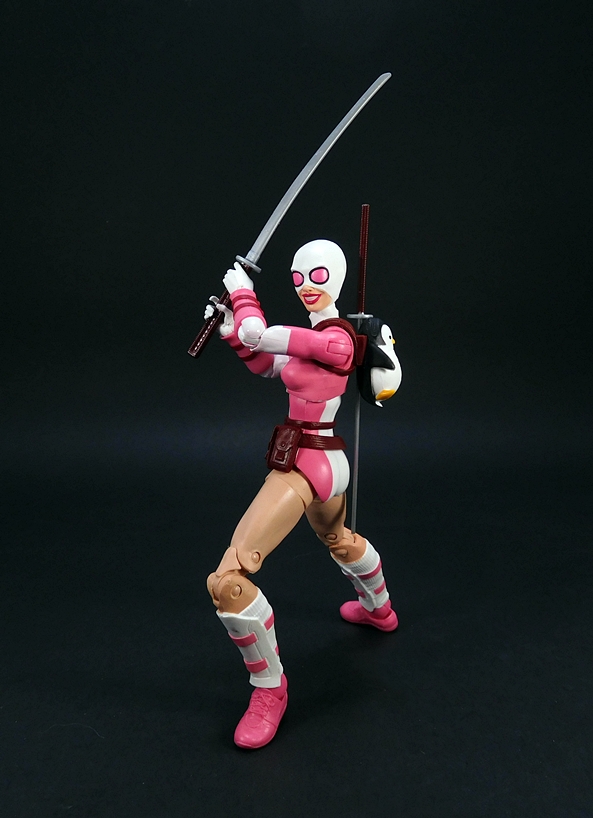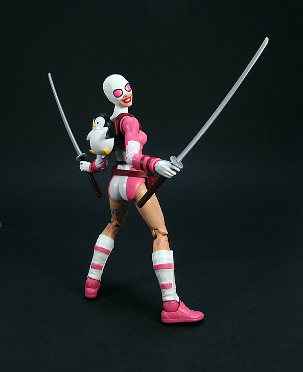 Her brown belt is a separate piece and includes her trademark pink “G” belt buckle. The belt features plenty of sculpted pouches, and even a place for her to keep her cell phone. The cherry on top of this outrageous outfit is her big fat cuddly penguin backpack, which includes slots for her to keep her katanas. Everything about Gwen’s costume is beautifully done here. Hasbro obviously poured a lot of love into this gal, and it shows! The articulation is pretty standard for your average Marvel Legends lady. The arms have rotating hinges in the shoulders and elbows, and the wrists are on hinged pegs. The legs are ball jointed at the hips, have double hinges in the knees, and swivels in the thighs. The ankles have both hinges and rockers. There’s a ball joint just under the chest and the neck features both a hinge and a ball joint. My usual gripe about the lack of bicep swivels stands, but I can still get a lot of nice poses out of her.