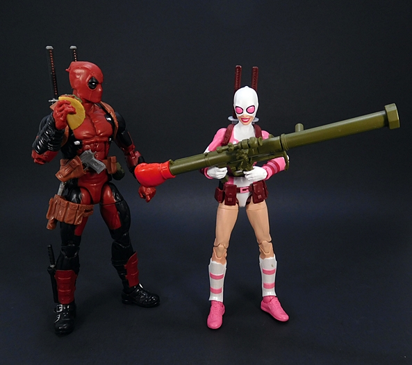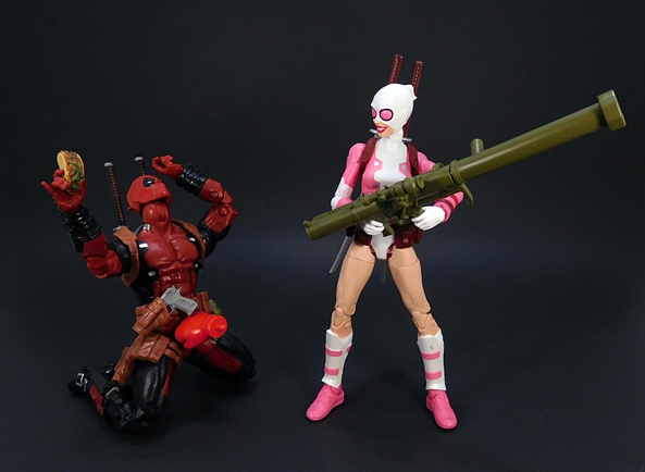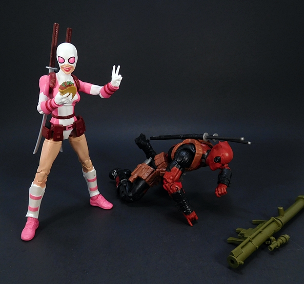 And here we have Gwen in her box and looking pretty spiffy against her hot pink themed background and with her snazzy logo down below. She’s obviously a product of the wild, breakout success of Spider-Gwen coupled with the cult of rabid Deadpool fans. But what really sells Gwen as a fun character is her self-awareness at being in a comic book, and her perceived lack of consequences that comes with that knowledge. She’s more than a lazy copycat character and more than a “What if” fugitive from another Earth. Everything about this character is on the nose, and I think that’s what makes her work for me so well. I’d complain that they didn’t shove a little PVC Howard the Duck into the box, but there’s already plenty of stuff in there, so I’ll hold my tongue and get started with this review!
