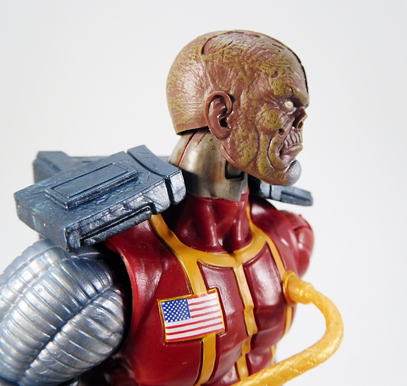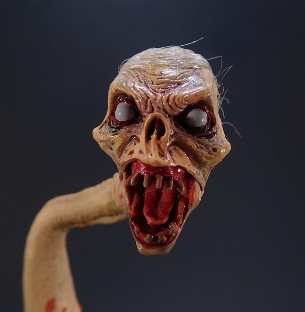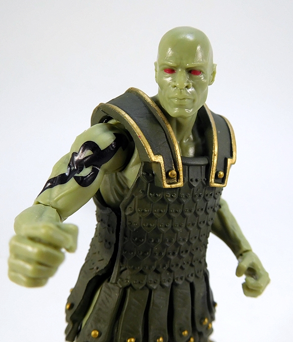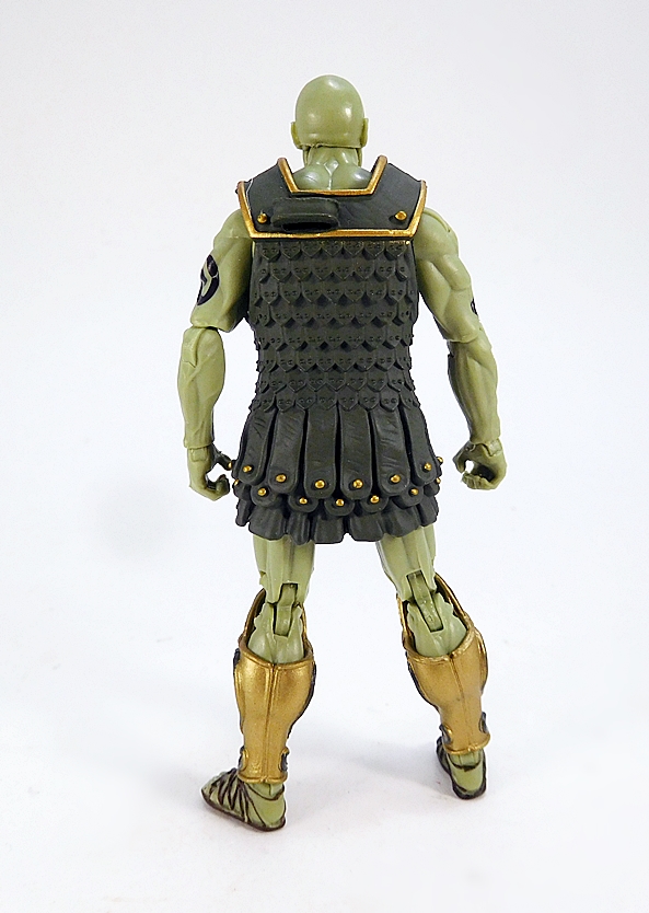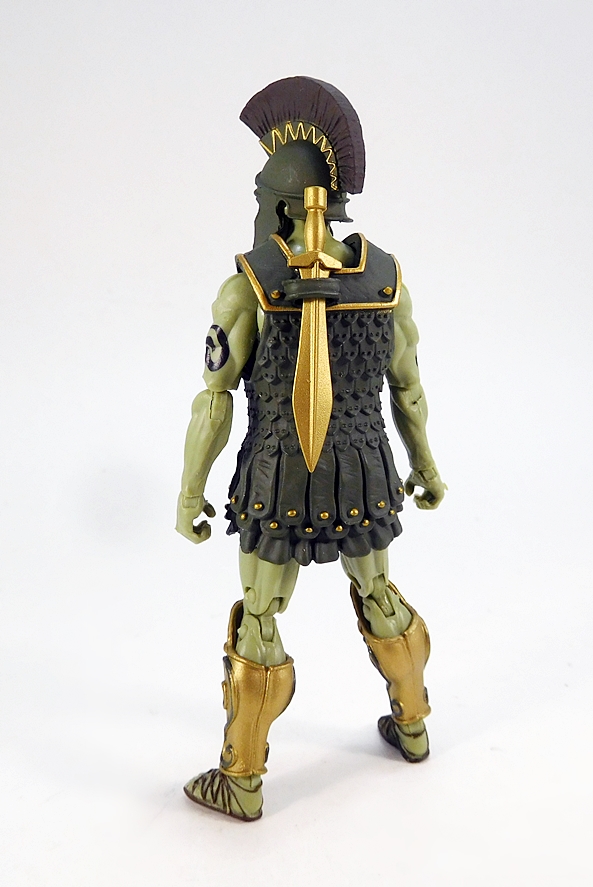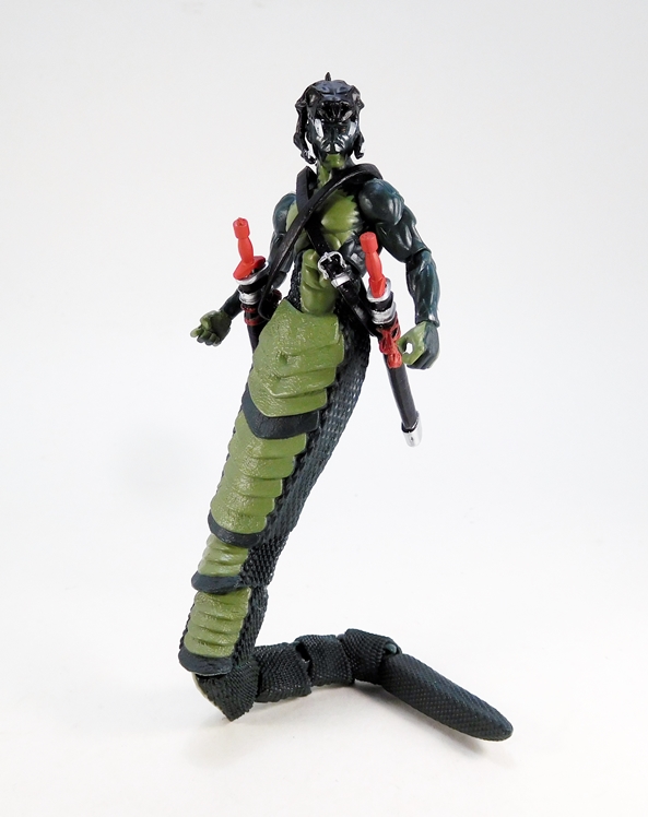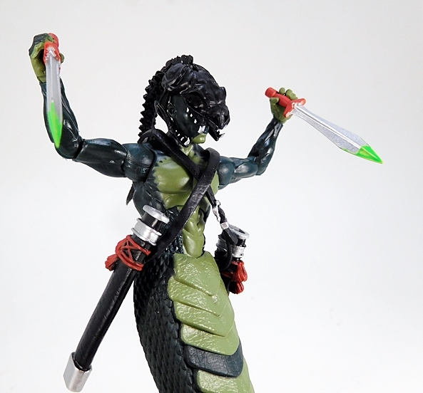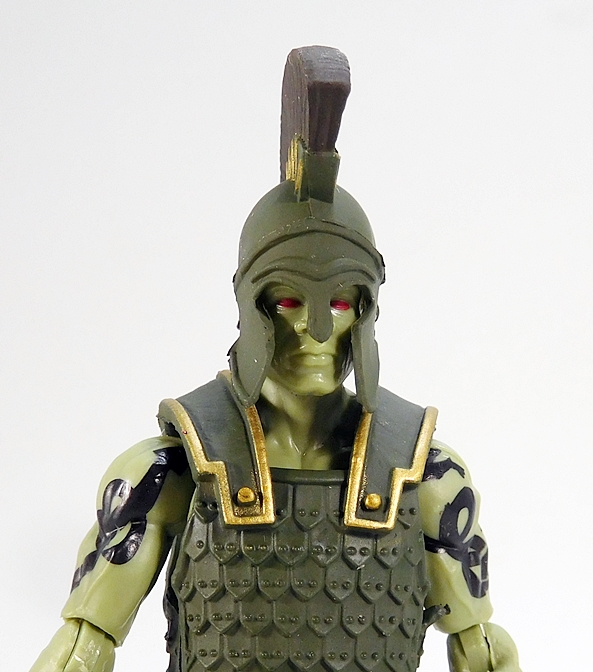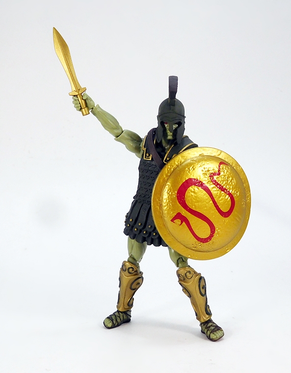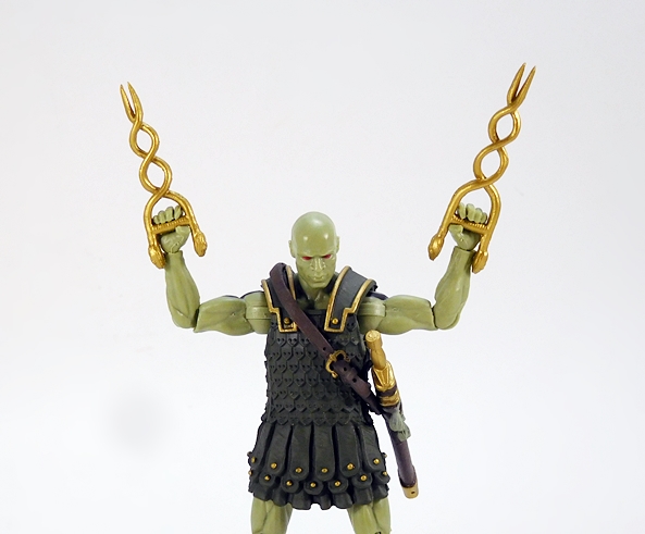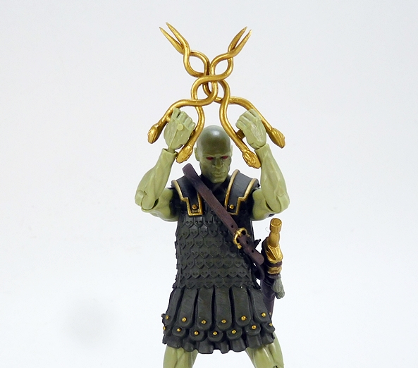 For starters, we get the skull and spine style helmet that we’ve seen with many of the lady Gorgons. This one is sculpted in black plastic with white paint on the fangs. The design of these pieces is just fantastic. The spine curves down the back of the neck, while the open jaws frame the figure’s face. If a half-snake warrior wasn’t intimidating enough, this headgear really launches him over the top.