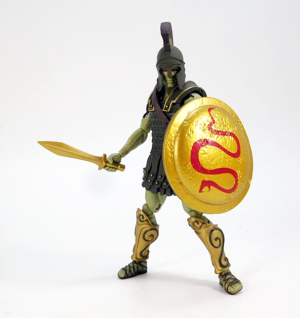 What do you get when you cross one of Eurayle’s warrior slaves with Stheno’s snake-morphing bite? A male Gorgon Berzerker who will stop at nothing to fight back the Spartan and Myrmidon armies. The Berzerker comes on your typical landscape-styled card featuring some nice character art on the front, and shots of the various figures from Waves 5-7, as well as the mysterious lost wave of variants. As always, the bubble is totally collector friendly and the package can be displayed standing on a shelf or swinging by a peghook.