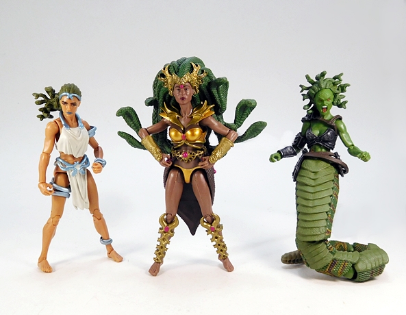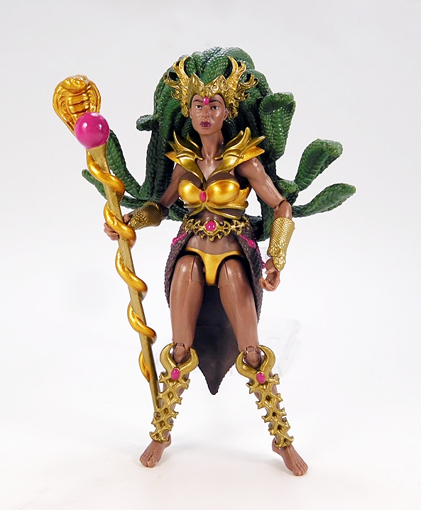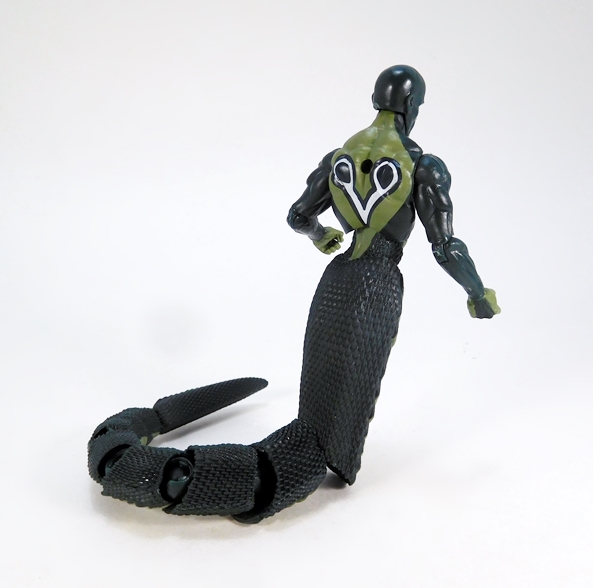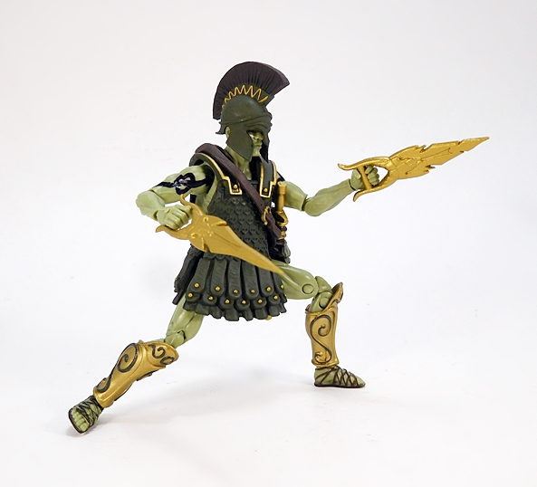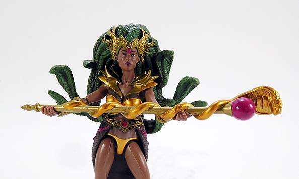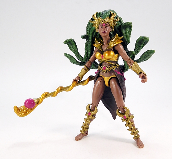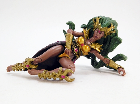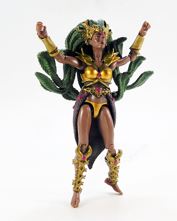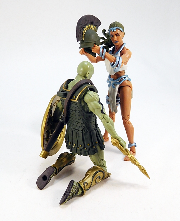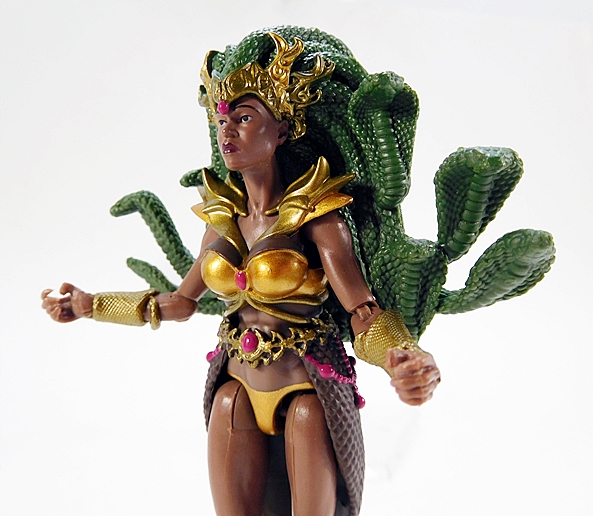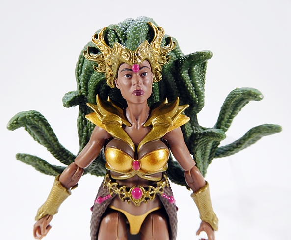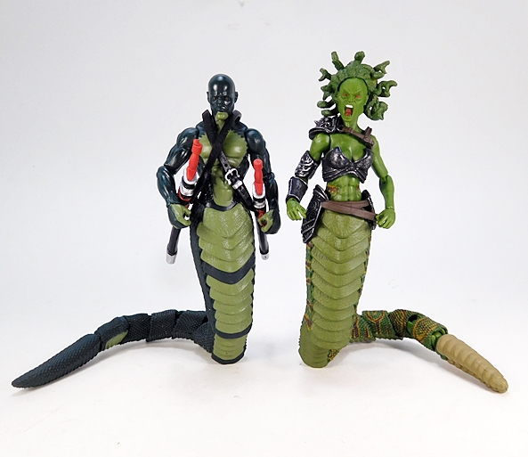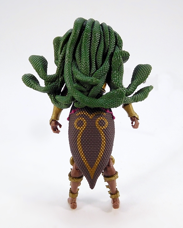 While the idea of going with a male Gorgon flies in the face of the Sisters’ matriarchy, it feels like a no-brainer for a line that likes to mix and match parts and I think the result speak for itself. The lower half features all the great articulation and texturing of the female Gorgons. The tail is segmented into multiple ball joints, which can be turned and twisted into a variety of poses, and I’m still amazed at how easily these half-snakes can be made to balance on their own when the tail is coiled up to form a base. We’ve had Gorgons in all different colors, but the tail on this figure is a very dark green with a lighter green underbelly.