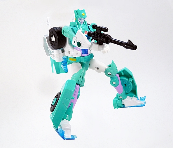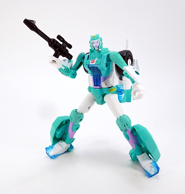 Moonracer comes with a pretty cool blaster, which we already saw in her alt mode. It features a scope and she can hold it in either hand and I really don’t have much else to say about it. Before wrapping up, let’s do a little side-by-side look with another femmebot…