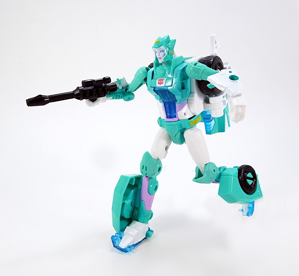 As a rule, I don’t have a problem with my Transformers wearing backpacks. It’s a convenient place to pack away kibble, but this? Yeah, this just isn’t acceptable to me. Poor Moonracer’s backpack is so damn big that she had to be mis-transformed in the package so the figure would fit in the bubble. When I opened her up, I was shocked at this amount of back kibble and then I realized that I still had to fold another piece into it and make it bigger. Surprisingly, she’s not too back-heavy. I’m thinking that those quarter-panels that protrude off the sides of her legs help to counterbalance her a bit.