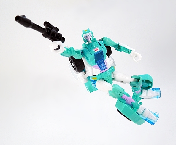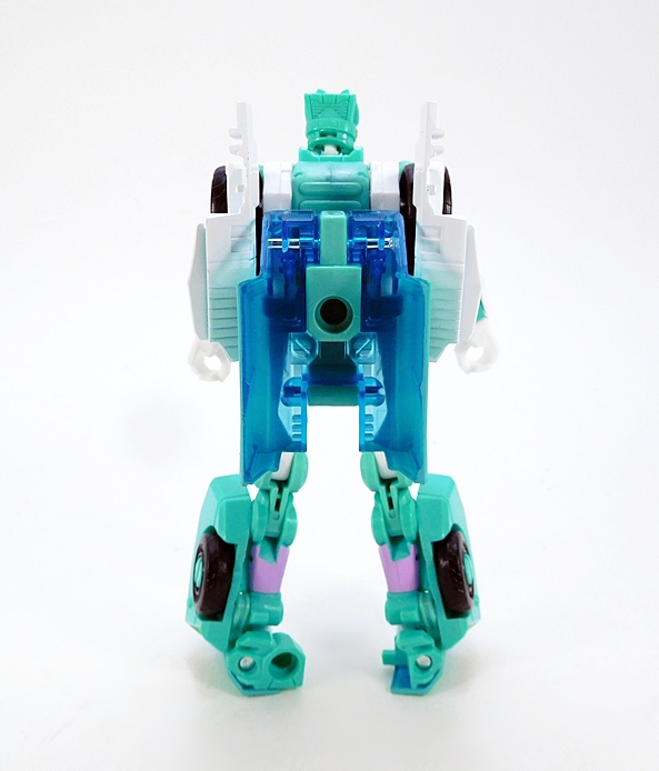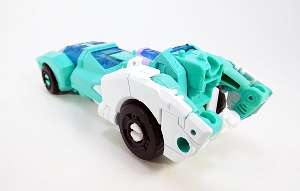 Moonracer is a futuristic car and not a bad one. She’s very long and pretty thin and has a pretty sleek styling that is a bit reminscent of a Formula-1 car. There are a number of tinted blue panels on the top, making it hard for me to decide which is the canopy for the driver’s compartment, because none of them open like on the Titans Return figures. I’m guessing it’s the one near the front. Or maybe none of them are, since this is probably supposed to be a Cybertronian vehicle? In addition to those tinted blue pieces, the bulk of the car’s deco consists of teal plastic with some white plastic in the back and some lavender paint hits. I don’t think she has the personality of Arcee’s convertible mode or the sexiness of Chromia’s lightcycle mode, but it’s fine.
