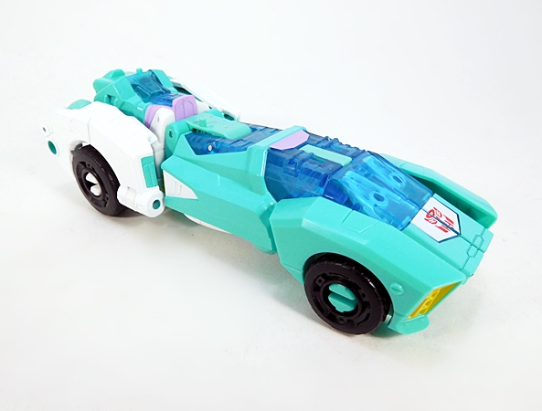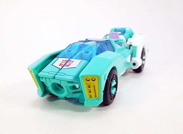 I like the front, especially the addition of the yellow paint apps for the headlights. She also has an Autobot insignia printed on her hood. There’s a very obvious socket in the front of the car that hints at her combiner capabilities, but I dig it as just part of the car’s weird design. I will say that she doesn’t roll all that well, as some of the undercarriage hangs pretty close to the ground.