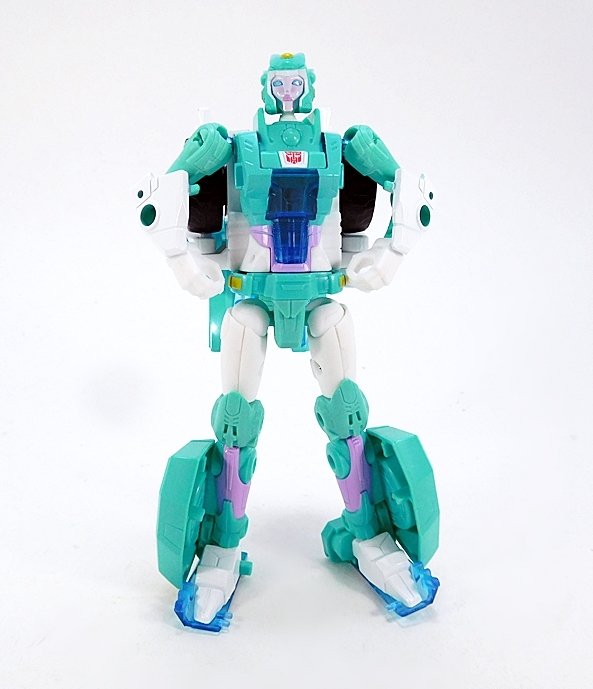 From the front, Moonracer isn’t too bad, but she’s still got some issues. For starters, you can see in her mid-section where they sculpted the hourglass shape that they wanted her to have, but behind it you can see that it’s just faked out and she’s got a rather blocky torso. The legs are fine, and they have that nice rounded organic look to them, but she has those two awkward quarter-panel shells from her alt mode just jutting out on each of her lower legs. Hey, at least they help to make her enormous feet look a little smaller. I’m also not a fan of having those windshield pieces on the bottoms of her feet. As for the deco, well the teal and white goes well together and she also has a splash of lavender and a tinted blue cockpit showing in her midsection. I think the coloring is a nice approximation of her animated look from the original cartoon.