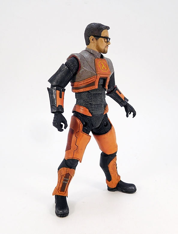 Gordon comes wearing his trusty Black Mesa HEV (Hostile Environment) Suit. It’s still totally recognizable as the iconic suit from the original game, which was a Mark IV, but with some notable changes (both cosmetic and functional), upgrading it to a Mark V. Suffice it to say, NECA did an amazing job recreating the suit in 7-inch scale plastic form. Despite being all cast as part of the buck, it has a convincing layered look to its construction. The mesh under-suit can be seen between the armor pieces on the arms and legs, and it’s sculpted to have a very fine chain-mail-like texture. The armor plates feature various cut lines and the lambda logo on his chest is actually sculpted as well as painted.