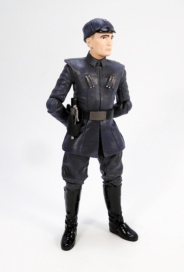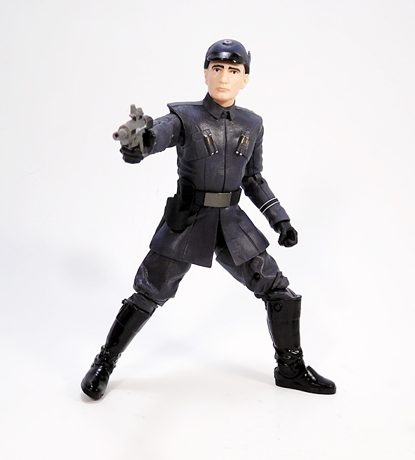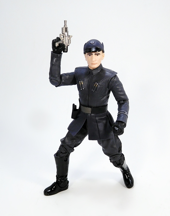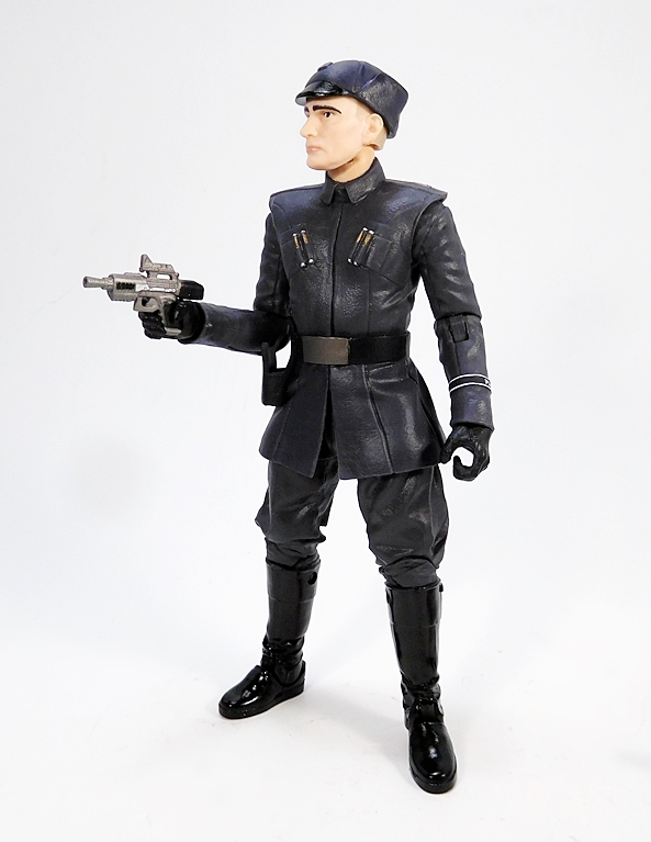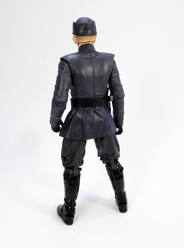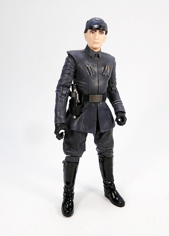 Ackbar does actually come with a blaster, and I’m always down with that. This one looks like it’s supposed to be an offshoot of the DH-17. I don’t know what happened to Ackbar’s little swagger stick. Maybe he just doesn’t use it anymore. Or maybe the Resistance is more of a rough-and-tumble kind of outfit that requires even the Admirals to be armed. Either way, I really dig the design of this little pistol and while Ackbar doesn’t really have a trigger finger on that flipper hand, he can hold the gun quite well. Alas, there’s nowhere to store it on his person. I would have liked a loop on the back of his belt to tuck it in there, so he could pull it out and repel boarders on the bridge of his Capital Ship. Whatever the case, Ackbar is a fantastic figure, and I would have been perfectly happy getting him as a single boxed figure. And that brings us to the First Order Officer…