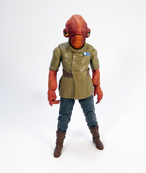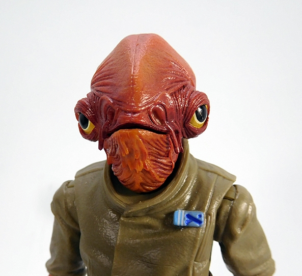 It’s kind of weird that we’re getting Ackbar from The Force Awakens before a Return of the Jedi version, but I’m sure that one will be coming down the pike soon enough. In this case we get the Mon Calamari Admiral in his Resistance uniform and while it’s kind of drab compared to the duds he was sporting in Jedi, it’s still a good look for him. His costume consists of a pea-soup colored tunic, which has a sculpted rank or ID badge on the left side of his chest. The plastic garment looks like it’s made to secure behind a sculpted front flap, which spills over his belt, concealing where the belt buckle would be. The rest of the outfit is rounded out with a pair of blue trousers and brown boots. I always thought it was weird that the Mon Calamari have giant fish heads and flipper arms, but normal feet. Indeed, Ackbar’s feet are kind of tiny, but he still stands just fine. There’s some really nice sculpted detail and texturing on his forearms and hands too.