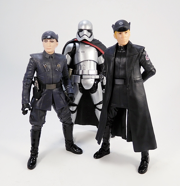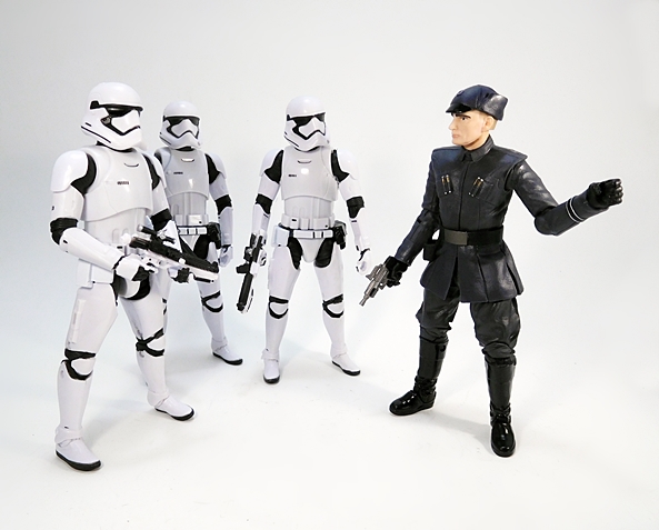 Don’t ask me why, but I love getting figures of Imperial, or in this case First Order, Officers. Maybe I have a delusion that someday Hasbro will release an Imperial bridge as a playset and I can populate it with all sorts of top brass. I doubt that’s going to ever happen, but it won’t stop me from snapping up these officers every time I see them. I have no idea what this fellow’s actual rank is, but he’s wearing a sharp-looking uniform that looks like it’s a very dark charcoal in color with shiny black boots. I really love the sculpted tunic on this guy. It has flared shoulders and it’s belted with one of those wide belts with a big slab of belt buckle, which hasn’t changed much from the Imperial days. He has two sets of rods on his chest, which I’ve been told are some kind of security keys, and he has a sculpted band around his forearm with white edges. The outfit is rounded out by a holster on his right side.
