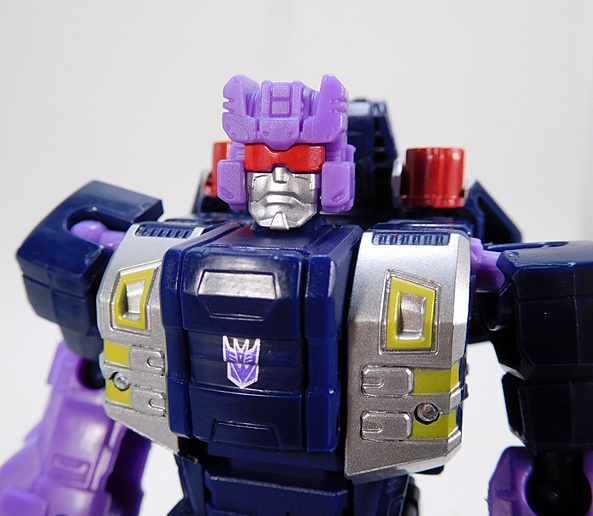 And that brings us to the head sculpt, and I’m happy to say that Blot is characteristically sporting a flat slab of head. The squared off “helmet” looks like it’s made to take a beating. The face is painted silver and he has a red visor across the top. Every bit of his face makes him look like an unpleasant fellow. I get the feeling that the phrase, “Oh crap, Blot showed up!” is a line often spoken at Decepticon gatherings.