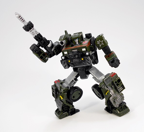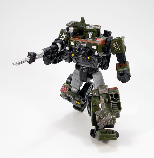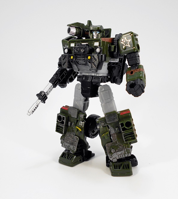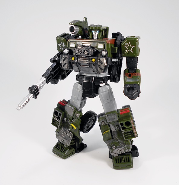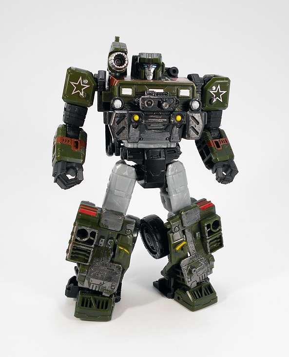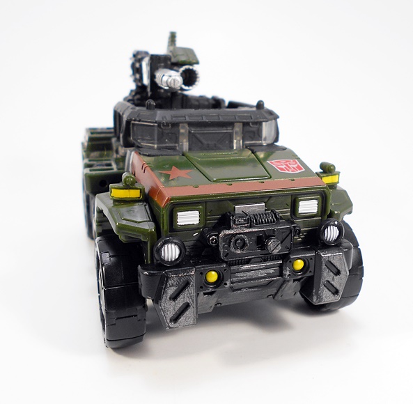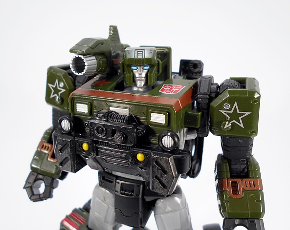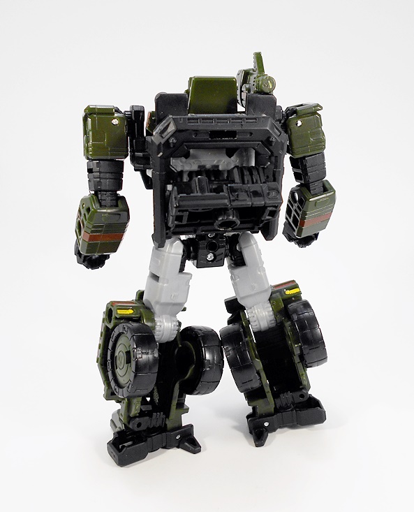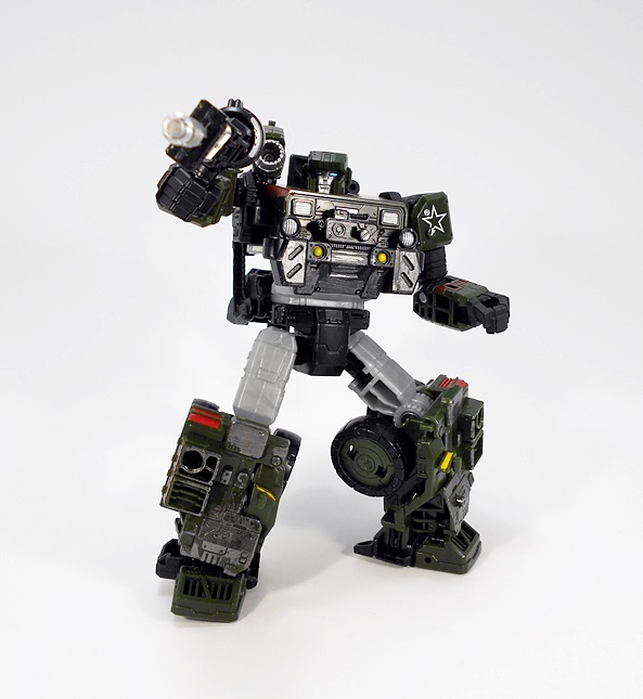 Holy hell! Suddenly I’m willing to forgive all the sins of the alt mode for this amazing robot mode. While the design certainly takes some liberties, it’s faithful in all the right places. It’s pretty cool how all four of the wheels wind up on his lower legs, leaving a clean upper half. The chest is beautifully boxy and appropriately Jeepy and I love that all the extra paint hits from the vehicle mode are prominently displayed here. Not to mention you get some more of that lovely dry-brushing on his lower legs. The proportions here are excellent as well, and I particularly dig the lateral rockers in his ankles.
