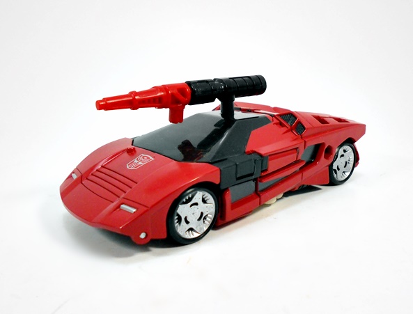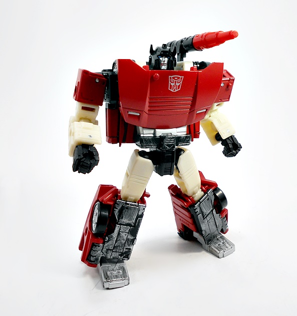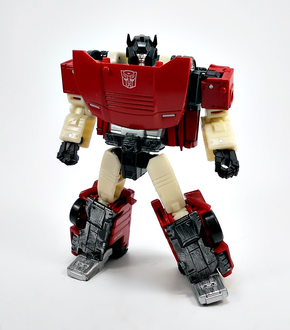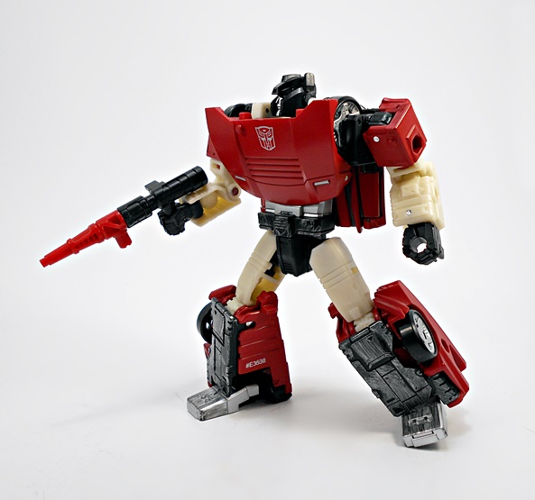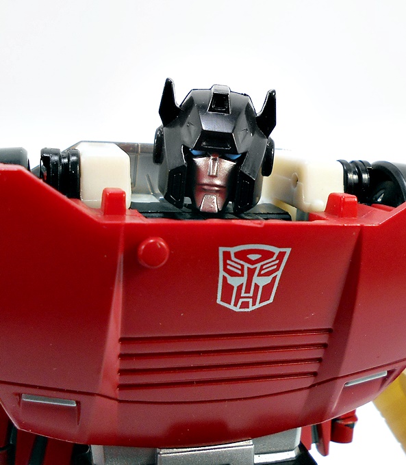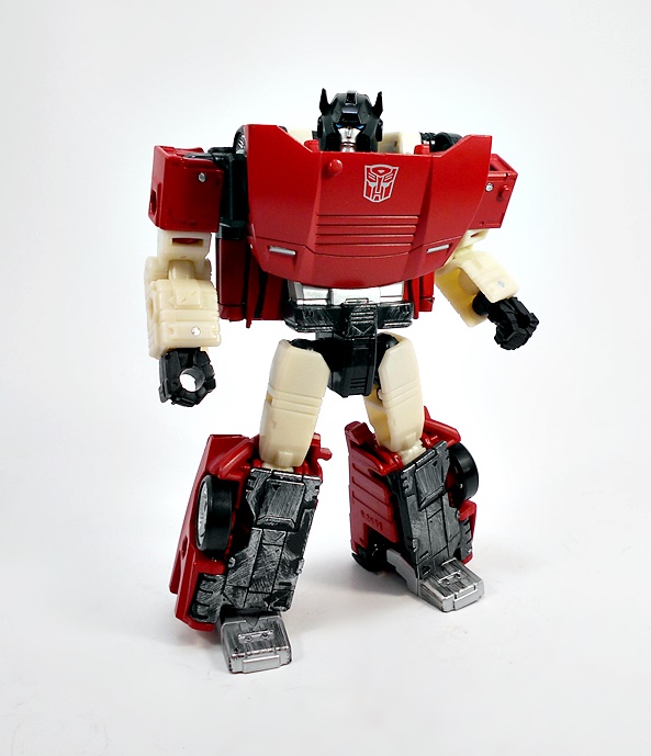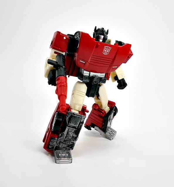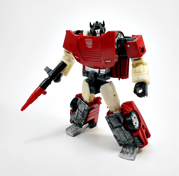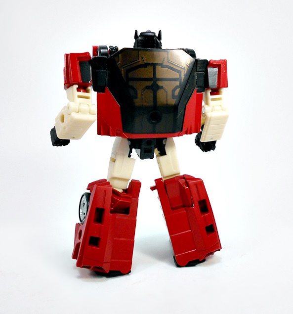Even from the back, Sideswipe’s design is super clean. Sure he has a big slab of car canopy for a back, but it’s rare that you get a Transformer that isn’t showing off some ugly bits from behind. As for the deco, it retains that nice red plastic, while adding a fair amount of off-white plastic in the arms, legs, and the frame around his neck. Some paint hits include the silver on his feet and waist, and some dry-brushing on his lower legs that look like wear and tear in the metal.