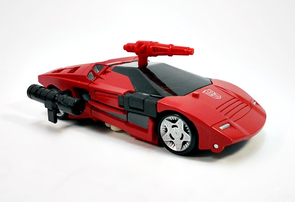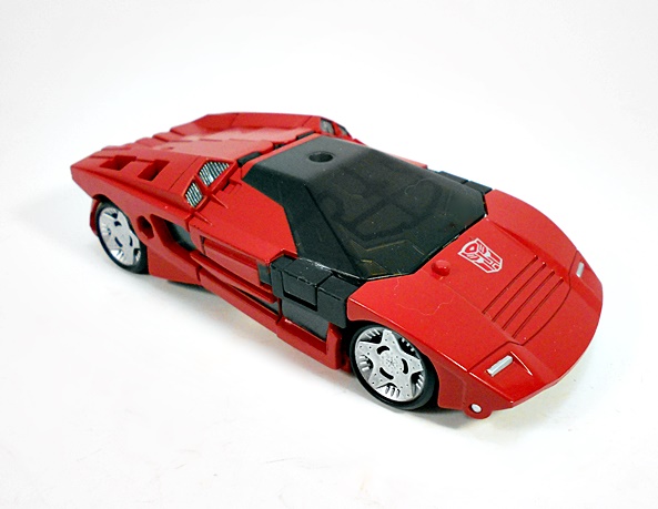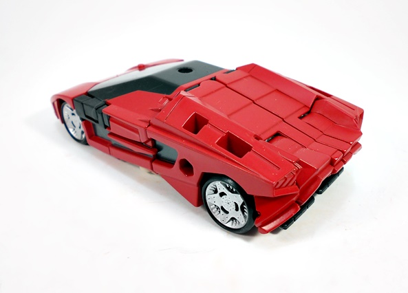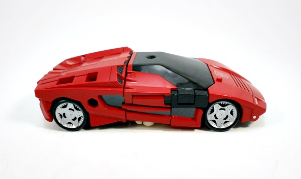 Whereas Hound’s felt like a bulked up version of his G1 Jeep mode, Sideswipe’s is more of a futuristic version of his G1 Lamborghini mode, and I dig that a lot. It’s like Siege is taking the underlying characteristics of these alt modes and buffing them. So Hound gets more military and brutish and Sideswipe just gets sexier. Indeed, what we get here feels like a Lamborghini concept car, although I suppose it could still pass for a Cybertronian vehicle. I like the contouring on this car and the intakes behind each side of the driver compartment. The ribbing on the hood is nice, but the sides of the car are pretty f’ugly thanks to some seams and hinges. I also wish the black parts, just above and behind the front wheel wells, were painted red to match the rest of the car.