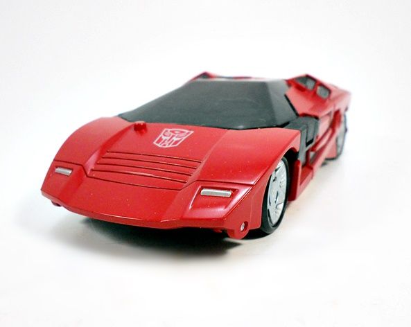 Here’s another look at the packaging as Hasbro does away with the card and bubble in favor of a collector friendly window box. I love these boxes and the character art looks fantastic. It’s just too bad that I don’t have the space to keep them. Sideswipe comes packaged in his robot mode, but we’re going to jump in to his alt mode first!