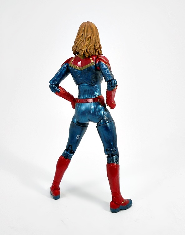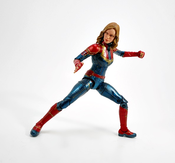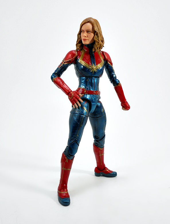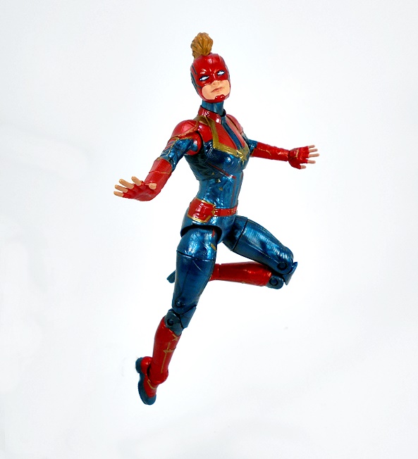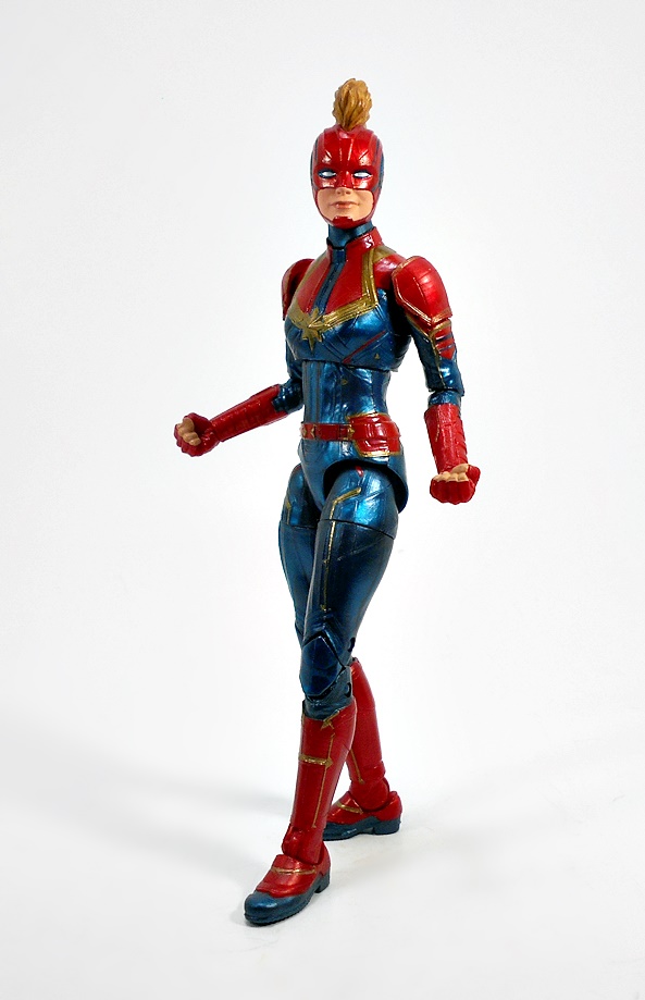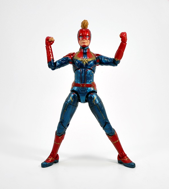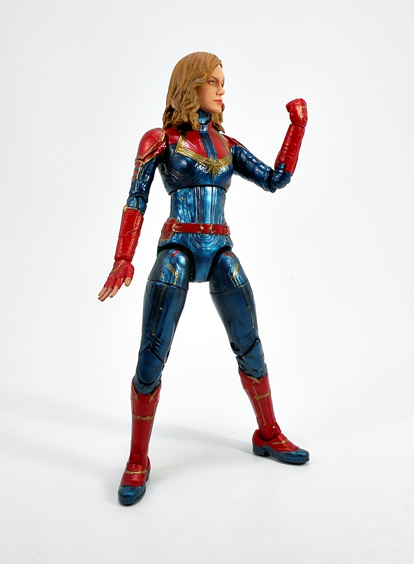 Articulation holds no surprises, but let’s break it down anyway. The arms have rotating hinges in the shoulders, elbows, and wrists, with no swivels in the biceps. The legs have ball jointed hips, swivels in the thighs, double hinges in the knees, and hinges and lateral rockers in the ankles. The torso has a ball joint under the chest and the neck has both a hinge and ball joint. And yes, I’ll keep beating the dead horse of how I wish Hasbro would give the ladies double hinges in the elbows instead of rotating hinges. Captain Marvel also comes with two sets of hands: Fists and open hands, to alternate between fighting and flying. You may have also noticed from the packaged shot that she does not come with a BAF part. I’m guessing Hasbro figured everyone was going to want her anyway.