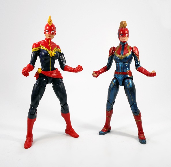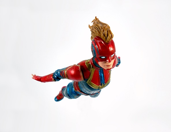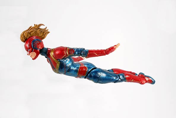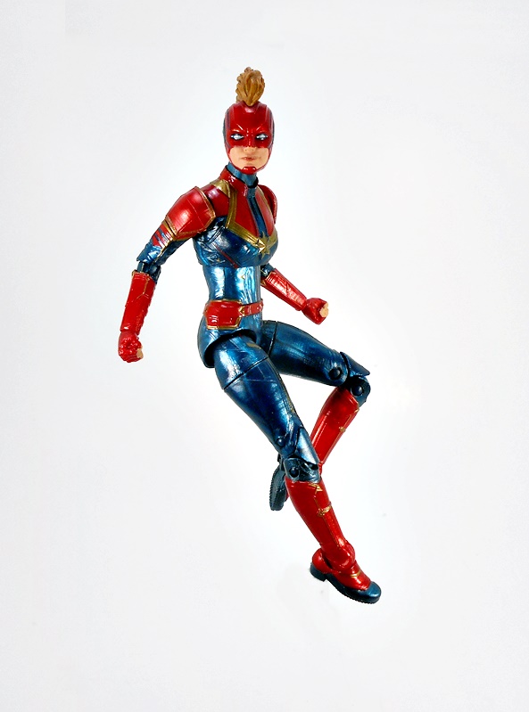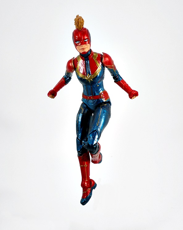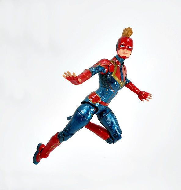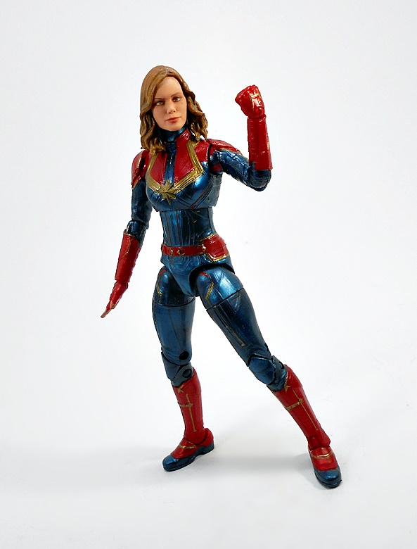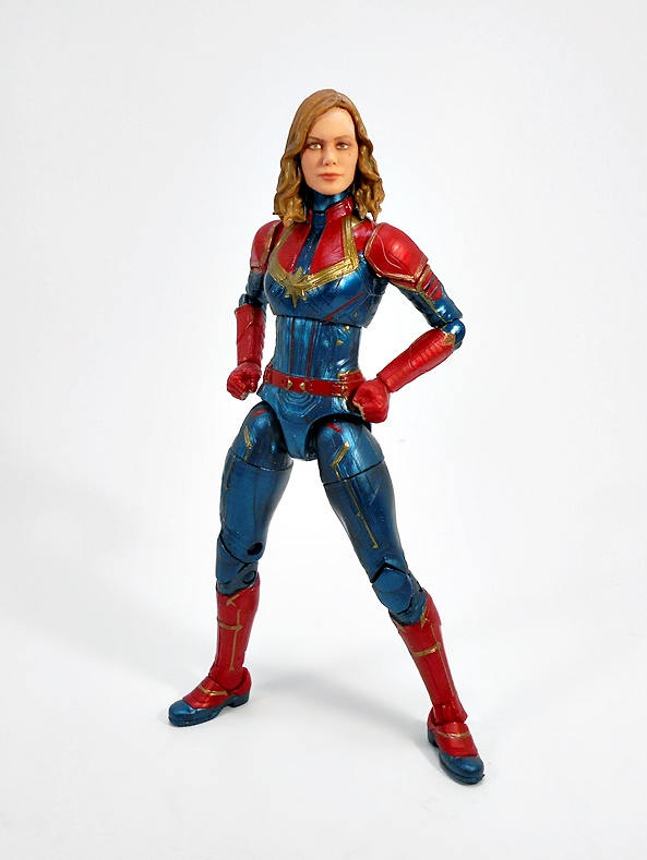 Articulation holds no surprises, but let’s break it down anyway. The arms have rotating hinges in the shoulders, elbows, and wrists, with no swivels in the biceps. The legs have ball jointed hips, swivels in the thighs, double hinges in the knees, and hinges and lateral rockers in the ankles. The torso has a ball joint under the chest and the neck has both a hinge and ball joint. And yes, I’ll keep beating the dead horse of how I wish Hasbro would give the ladies double hinges in the elbows instead of rotating hinges. Captain Marvel also comes with two sets of hands: Fists and open hands, to alternate between fighting and flying. You may have also noticed from the packaged shot that she does not come with a BAF part. I’m guessing Hasbro figured everyone was going to want her anyway.