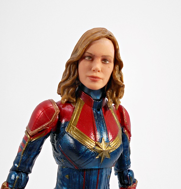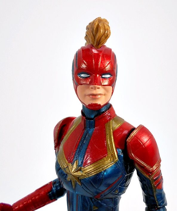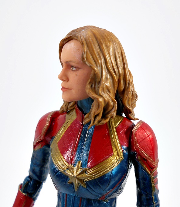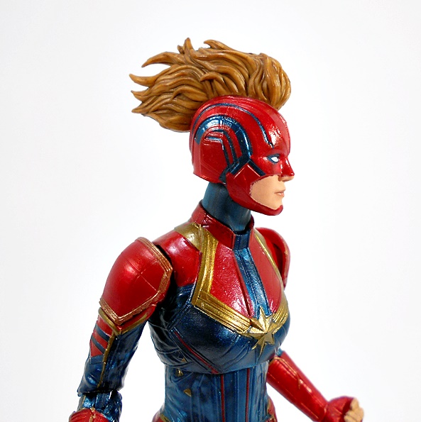 The unmasked head utilizes all of Hasbro’s newly learned techniques to deliver a solid likeness of Larson. The skin tone is soft and matte to avoid a waxy look and the printing for the lips is sharp and subdued, but as always when you get in close, the printing starts to blur even though it looks fine in hand and with the naked eye. The expression is pretty flat and I’ve seen some criticisms of the trailer, saying that Larson doesn’t emote much, but here we get a hint of a smirk that I think works well for the character. Personally, I think people are getting a little too hung up on a few minutes of footage, but time will tell. Danvers’ hair is sculpted separately from the head, which adds some nice depth to the portrait overall and it’s given a dark sandy wash.