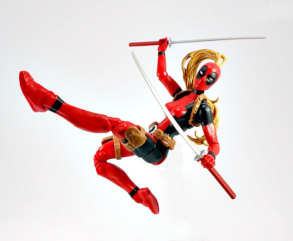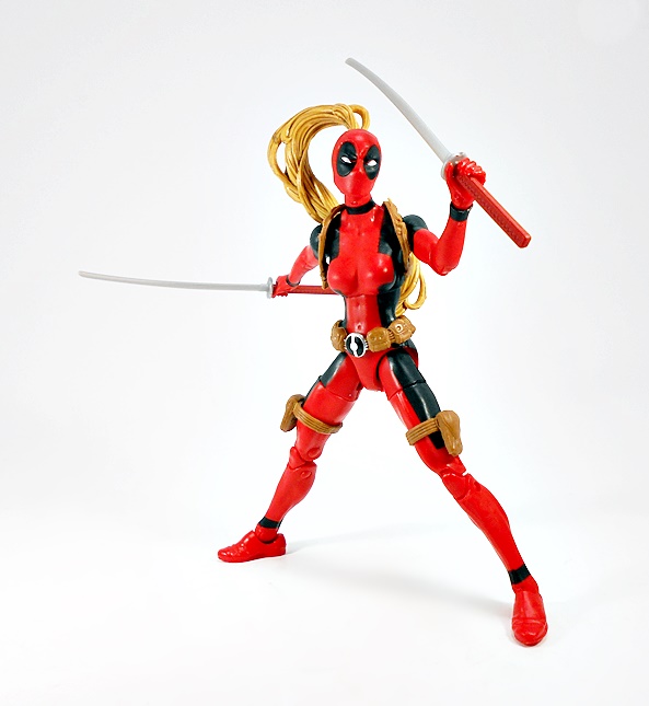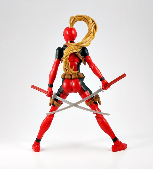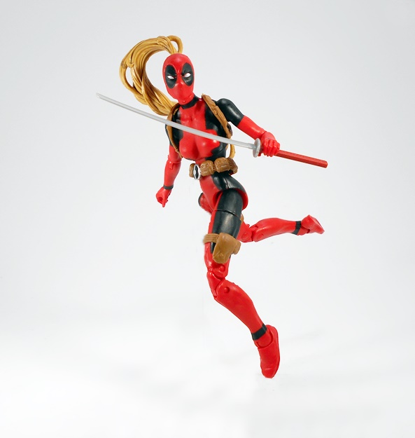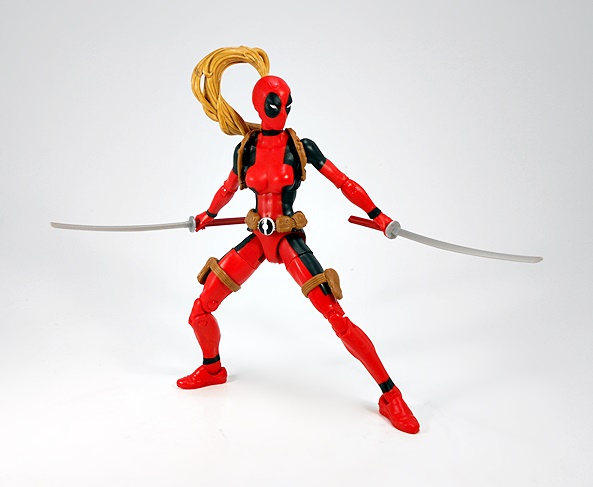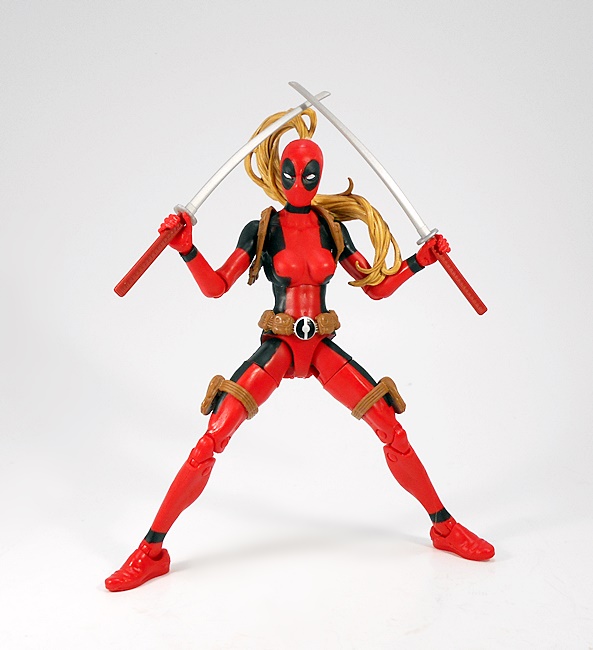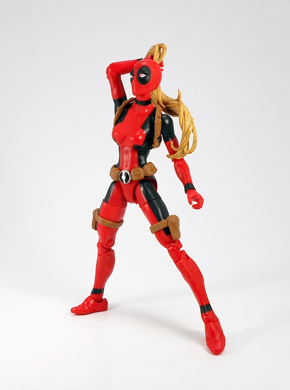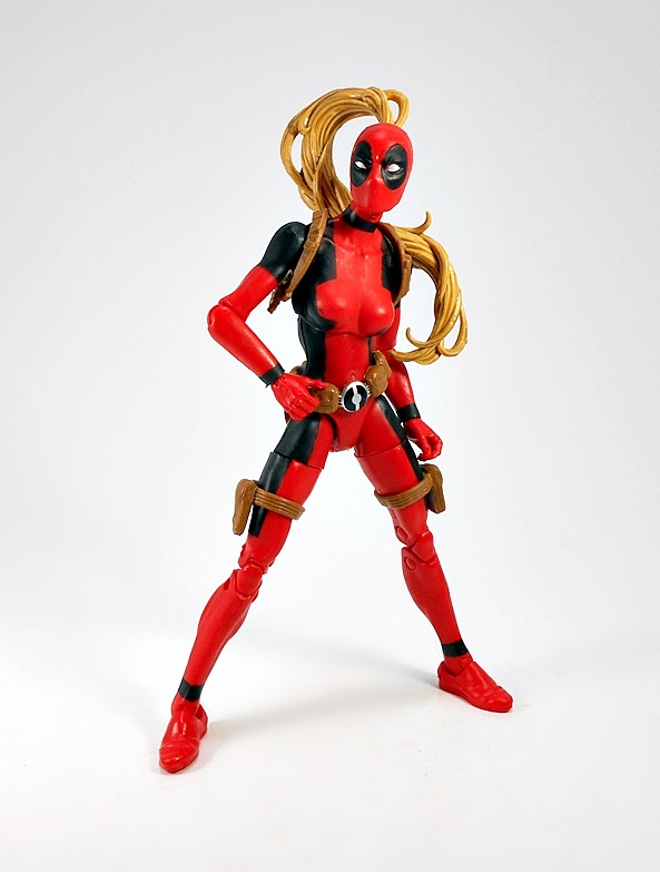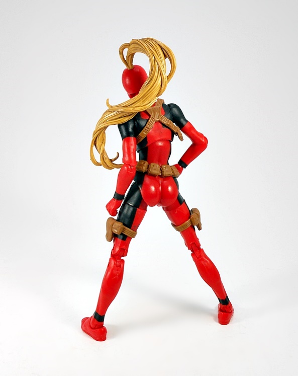 Hey, it’s a basic female buck in Deadpool colors! Well of course it is, what else would I be expecting? The red is very red, the black is very black, and the paint lines are very… well, they could have been a lot sharper. Normally I’m not a huge stickler about this, but when the bulk of the costume comes from the paint, I’d like some crisp lines. Indeed, from the neck down, the only original sculpting on this figure comes in the form of her attached gear, all sculpted in soft brown plastic. This includes patches strapped to each of her thighs, a belt-o-pouches around her waist, and a shoulder rig, with a modest two-pouches, positioned under her right armpit. The sculpts have some nice detail, the belt buckle is painted in a silver and black variation of the old Pool emblem, and my only real complaint here is that the thigh straps are held up only by friction, so they have a habit of sliding down her legs. I’ll likely just end up securing them each with a drop of glue.