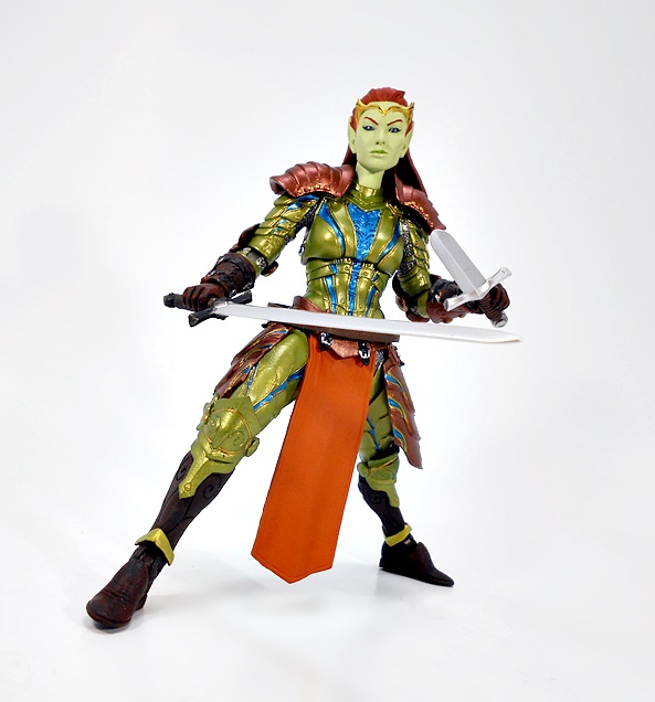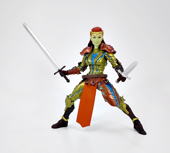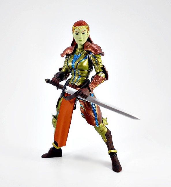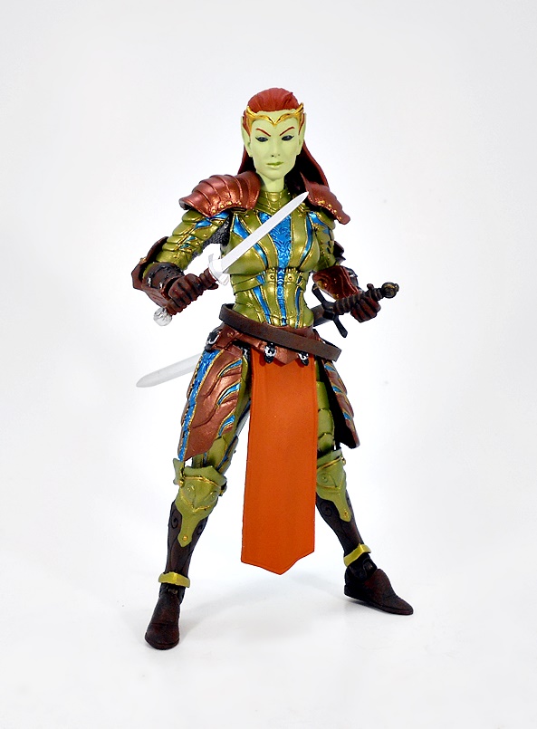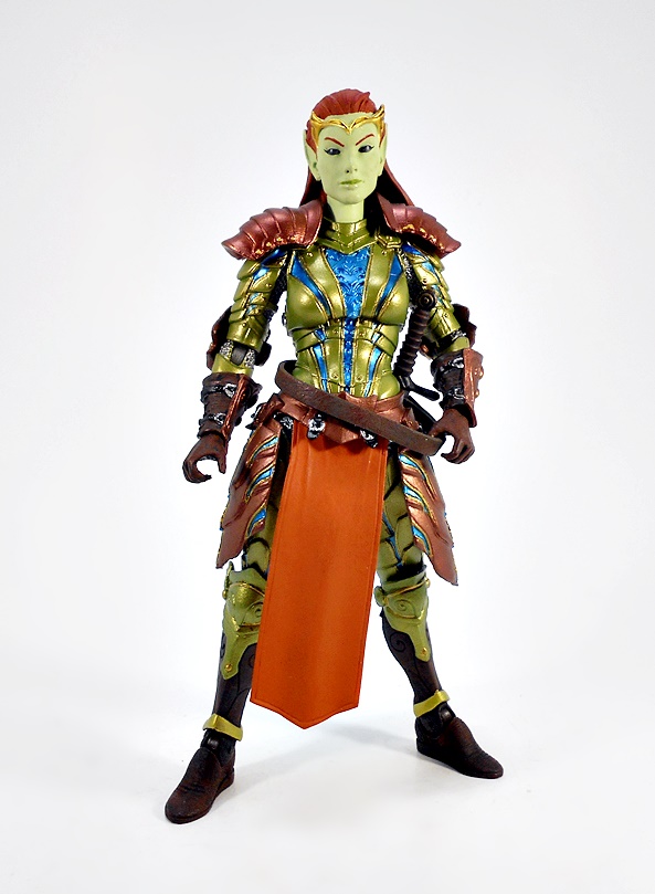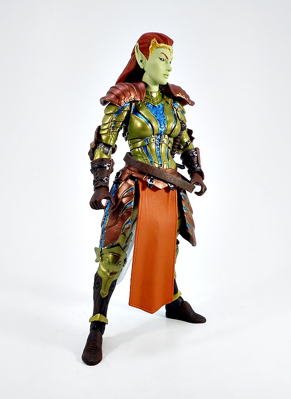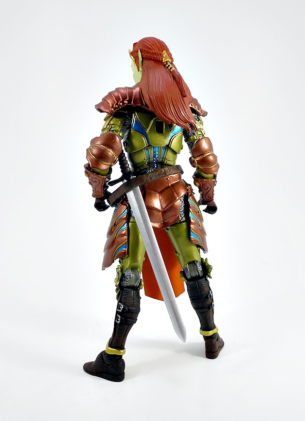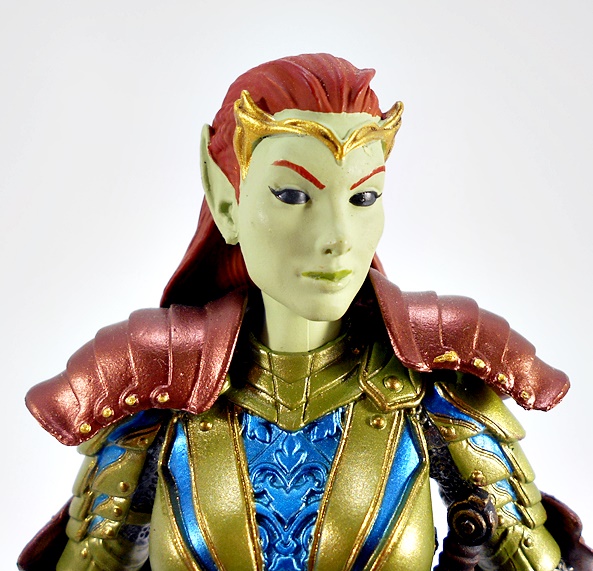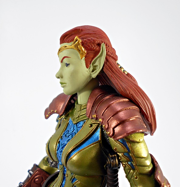 While the neck down may be a case of been there, done that, Myria does sport a brand new head sculpt and it is very nice, indeed! She has a pale green complexion, which may or may not be the norm for the Whisperlings, with green lips, and pupil-less ebony eyes. The eyes would probably look horrifying on any other figure, but here they just make her look more mysterious and exotic. Myria features a gold tiara sculpted as part of the portrait, as well as long red hair, which falls back down her neck and leaves her long pointed ears exposed. In the back, her hair is sculpted with two sets of braids that join together in a golden clasp, similar to what we saw with the Elf Ranger.