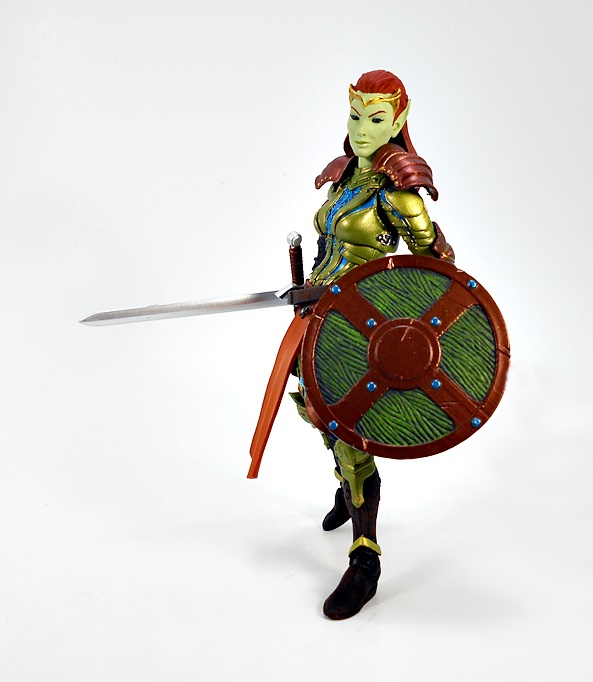 And here’s a She-Elf that can enchant my forest any time! The bulk of Myria’s armor comes from the standard female knight body that was introduced with Gwen Heavensbrand. This includes the torso, the upper arms and upper legs, and the hip piece. The plate armor is given a little bit of a lighter touch with the elf bracers for the lower arms and the boots, which are sculpted and painted to look like leather with reinforced plates on the knees and around the ankles. Instead of the crotch plates, Myria gets by with the lower tabard piece, which is sculpted in soft plastic. This is the only part of the figure that doesn’t quite work for me. I’m not sure if it’s the color or not, but I would have rather they used the leather scale armor piece here instead. But, because Mythic Legions is totally modular, I could always borrow that piece from another figure and make the change myself!