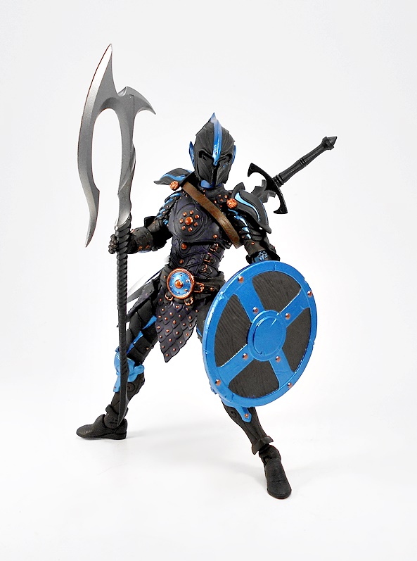 As the name suggests, the base coloring here is a bit subdued, but there’s plenty of flourishes to brighten things up. Much of the armor on the arms and legs is a deep brown with the cuirass and waist armor featuring a purple wash. t works well to make the armor look more like leather than plate and also contrasts nicely with the electric blue metallic paint used for the bracers and knee armor, which are clearly supposed to be plate. Similar blue is used for some of the accents on the upper legs, upper arms, exposed chain-mail, and pauldrons. Copper paint is meticulously applied to all the tiny sculpted rivets, as well as the buckles on each of the individual straps on the armor. The blue and copper mingle beautifully for the disc-shaped belt buckle, and all in all, this is another fine example of some rather unorthodox color choices turning out a striking figure.