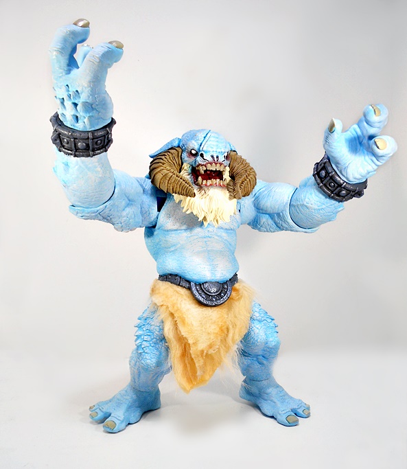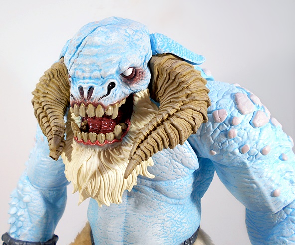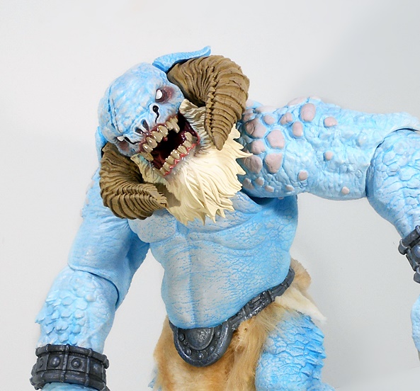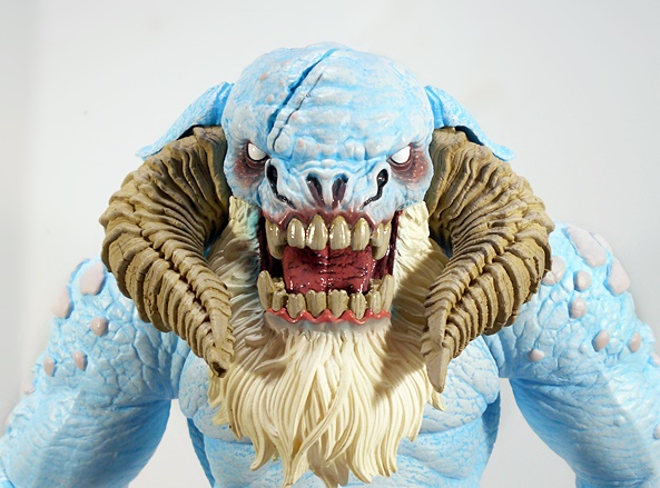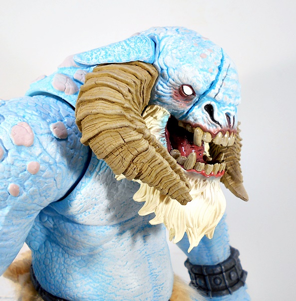 Of course, all the new sculpting went into this big fella’s noggin, and I have to say, this is a glorious head sculpt. It’s part Troll, part Abominable Snowman, and part TaunTaun. There’s just enough similarities in those beady deep-set eyes to allow me to see the resemblance between him and the Stone Troll. And man, those eyes are creepy. The white peepers framed in bloody red sockets give him an Evil Dead Deadite kind of feel, and that ain’t a bad thing. The ears here are longer and and swept back, almost like an angry cat and the wrinkled forehead shows a deep battle scar running up from the right eye. The bushy white beard is framed by the two TaunTaun horns, one of which is cracked at the tip to further show that this guy has seen some action. I actually thought that was damage to my figure, before I looked more closely at it. Sadly, the jaw is not articulated, but it is partially open to show both sets of horrible looking teeth and the glossy paint inside makes his maw look suitably wet and realistic.