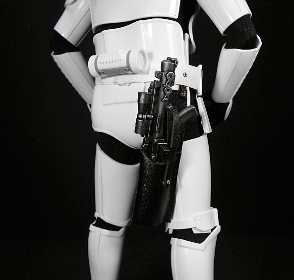 The belt is plastic on the front and fastens in the back with elastic and velcro, which holds it on surprisingly well. There’s a leather-like holster that hangs off just behind his right hip, and this houses his E-11 Blaster and features a retaining strap that is secured by a magnet. The holster is very easy to work with and I don’t have any concerns about the strap tearing. Besides the blaster, which we’ll check out in a second, the only other actual accessory included is the cylinder that goes on the back of his belt. I think this is referred to as a thermal regulator, and it attaches onto the belt with two metal hooks, which also helps conceal the velcro patch that secures the belt. I’ve found that the belt itself can ride up a bit on the figure when I’m posing him, but otherwise it fits fine and looks great.