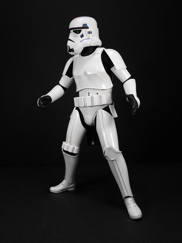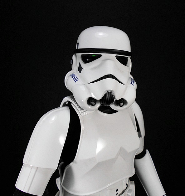 As simple as the figure is, it’s still an underlying articulated buck that’s actually wearing the armor, and that obviously sets it apart from most of the other Stormtrooper figures out there. The figure is first dressed in a very soft fabric bodysuit, which can be seen in the joints and between the armor plates. This is a big departure from the leather-like bodysuit that Hot Toys First Order Stormtroopers wear. The result is that the underlying suit doesn’t really hinder the articulation at all, even though the armor plates themselves in some cases do. The armor pieces themselves consist of upper and lower legs, sleeves for the forearms and biceps, shoulder pieces, a codpiece and a butt plate, a wrap-around for the abdomen, a chest and back plate, and of course the helmet. The boots are sculpted plastic and the armor pieces on the backs of the hands are sculpted as part of the hands. And you do indeed get a nice assortment of hands, including a set of weapon hands, fists, relaxed hands, a “stop” hand, and a hand designed to cradle the blaster. The armor pieces have a nice glossy finish to them, and are some very subtle weathering marks here and there.