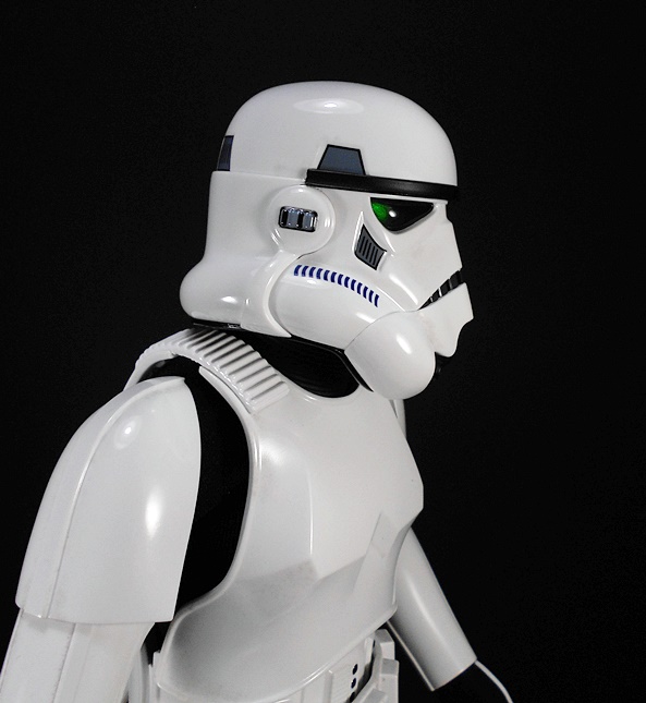 And finally, Stormy comes with a pretty standard figure stand. The base is rectangular and designed to look like the deck plating of an Imperial ship. The name plate simply reads, “Star Wars Stormtrooper,” and the post is the usual crotch-cradle design, which works fine with the figure. And herein lies the big difference between the regular and Deluxe releases. The Deluxe version includes an LED Death Star backdrop panel to put behind the stand. It’s a very nice addition, but at $243, that makes it $55 more than this regular release? Nah, I’m good, thanks!