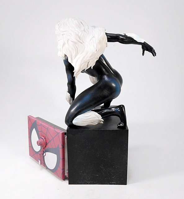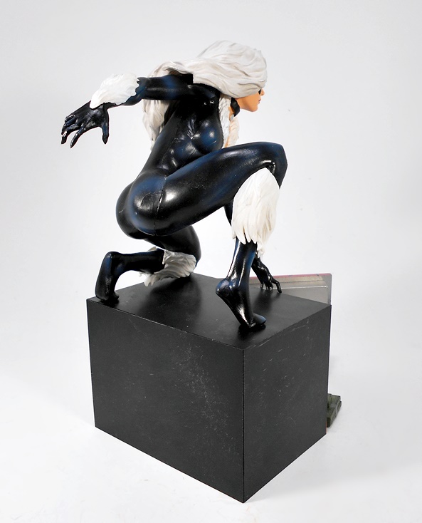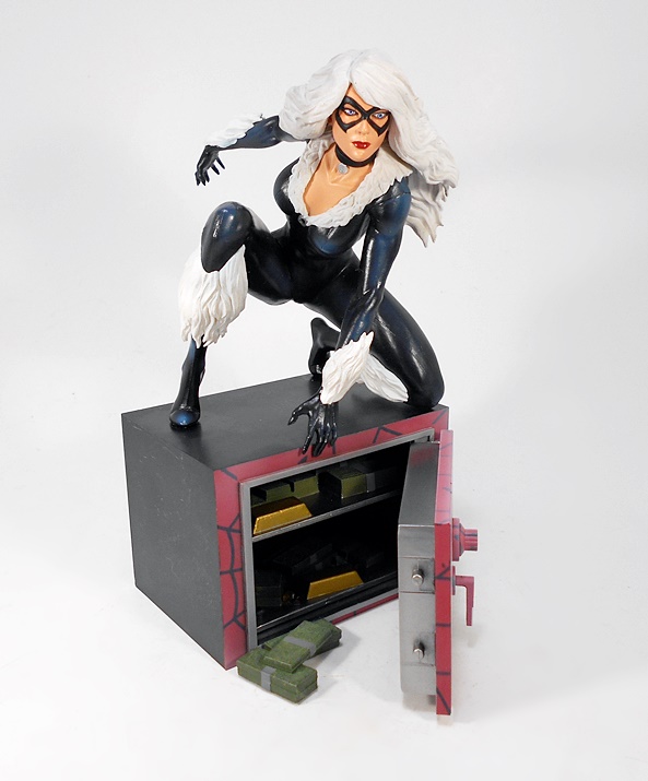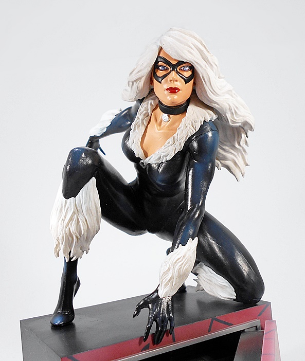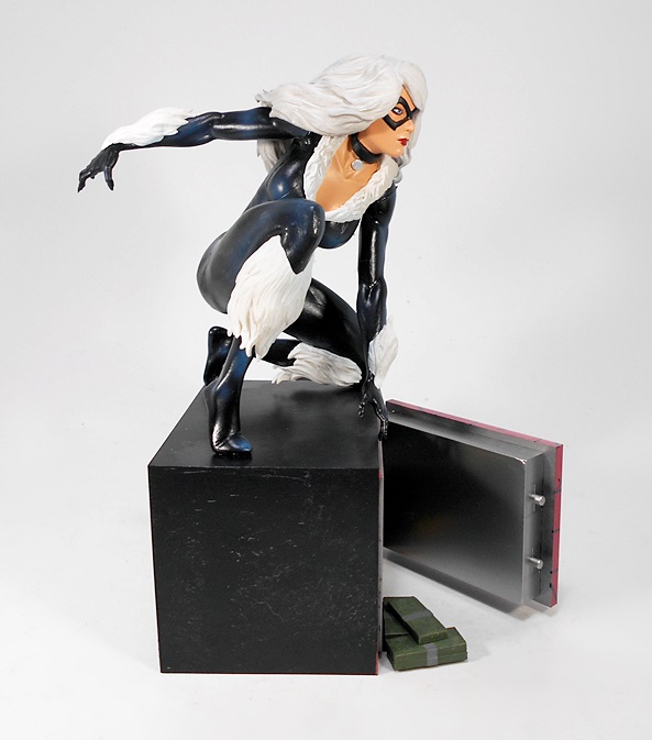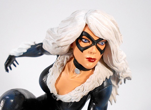 I definitely dig the pose here. It’s very dynamic and works extremely well for the character. She looks like she may have just jumped back atop the safe after opening it, and is ready to go a few rounds with a rival. This is definitely classic Black Cat, with the slick bodysuit, garnished with the tufts of white fur around the forearms, lower legs, collar, and plunging neckline. The suit itself doesn’t feature much detail, but it does have a very nice blueish-black sheen to it that mimics the coloring right out of the comic panels. The sculpt shows off all of her curves, and even a little bit of musculature under the suit.