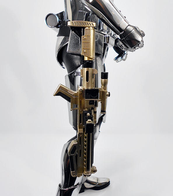 As we’ve already seen, the only other accessory in the box is her customized F-11D Blaster rifle, and I am absolutely in love with how this weapon turned out. The details are so sharp and the platinum finish with black trim is drop-dead gorgeous to me. It includes a scope, a telescoping stock, and a swing down grip under the barrel. The accessory is also magnetized so it can be worn on her right hip without the need for a holster. The gun works quite well in her weapon-holding hand and she looks great wielding it!