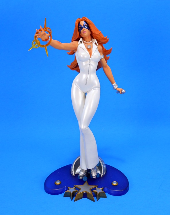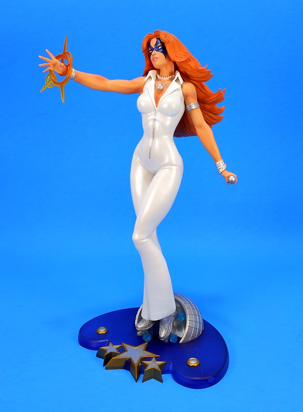 Our final stop on this statue is a look at the funkadelic base, I think DST did a great job designing this one. You get a blue platform with a couple of sculpted stage lights, a cluster of groovy gold and silver stars, and a partial mirror ball behind her feet. It’s not as elaborate as it could have been. I was thinking her balanced atop half a disco ball, but there’s something to be said for being understated. Either way, every bit of this base fits Dazzler to a tee.