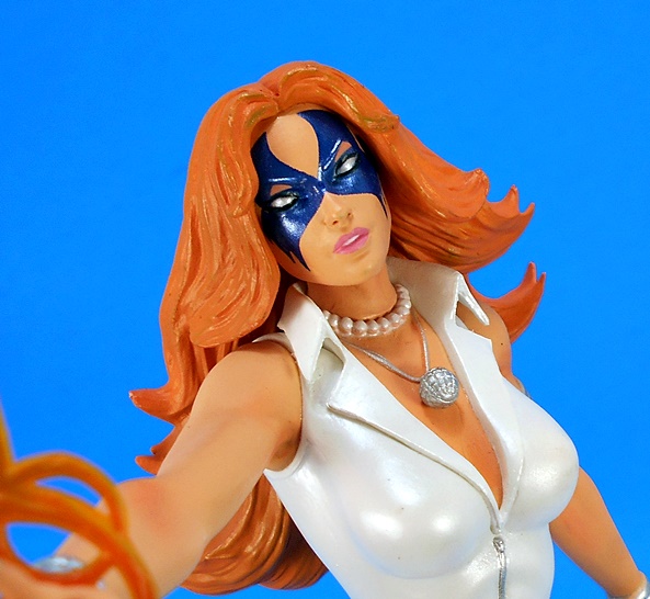 And check out the portrait! She’s a stone fox, man! Her face is painted with her trademark blue eye mask, which is sharp and has a subtle glittery finish to it. Alison’s pupil-less eyes have a silver sheen to match her costume, and her pink lipstick is a little understated. Finally her hair radical orange-blonde coif of hair flows nearly symmetrically behind her. I think I would have liked more of a yellow hue to her hair, but I’m still fine with what we got.