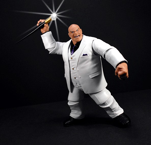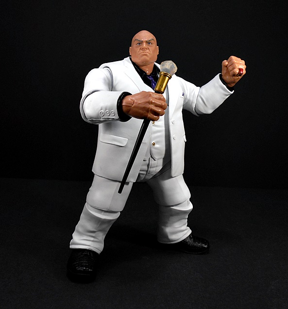 Finally, Fisk comes with his cane, which is a simple accessory but looks great. It features a sharply tapered staff with a gold fixture to hold the frosted diamond at the end of it. He can hold it in his right hand, but in order to get a firm grip on it, he has to hold it right at the base of the gold fixture, otherwise it just slips out.