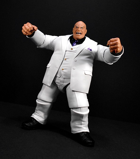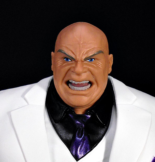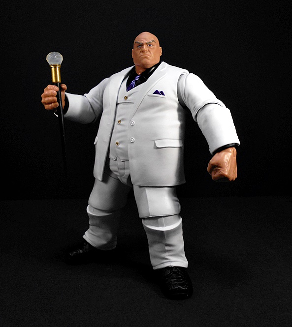 And here is Fisk in all his rotund glory. Kingpin is comprised of your six basic BAF parts: Torso, arms, legs, head and a few extras, which we’ll look at in a minute. He dons his trademark white linen (plastic) suit. Yeah, it surprises even me that I can get this excited over an action figure of a big, bald guy in a suit. But, as a character, Kingpin has a sense of frightening gravitas about him, and this figure conveys that perfectly. Indeed, this bulbous buck makes him look like an absolute powerhouse! The suit consists of a sculpted vest with a collard shirt and tie peeking out the top. The buttons on the vest are neatly painted gold, the shirt is black, and the tie is purple. The trousers show some sculpted rumples, especially where they rest on his giant black shoes. The suit’s coat is the usual trickery, where it is sculpted without sleeves and the sleeves are sculpted as part of the arms. In this case, it’s a little obvious, but I still dig it. Some other nice sculpted details include the ring on his left hand and the neatly folded handkerchief that’s sculpted peeking out of his coat pocket.