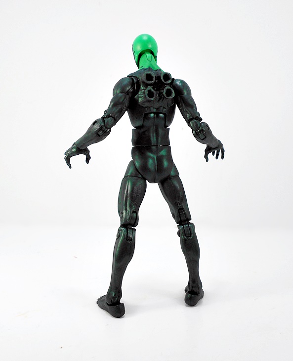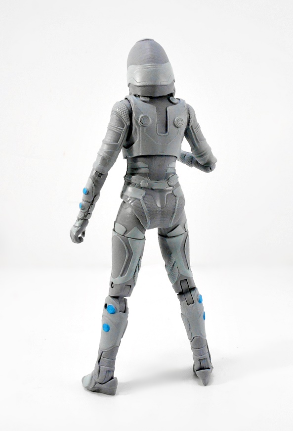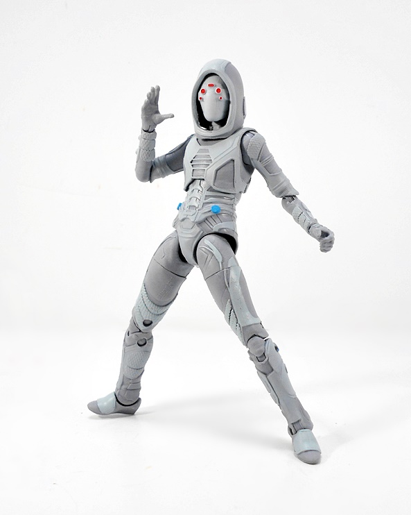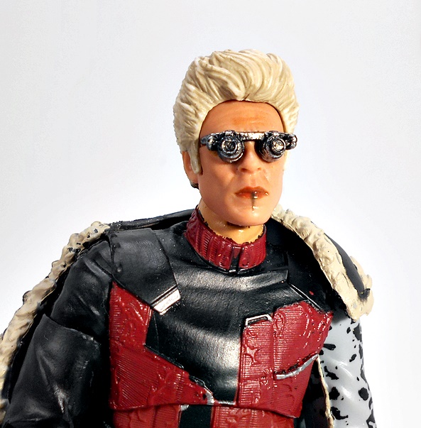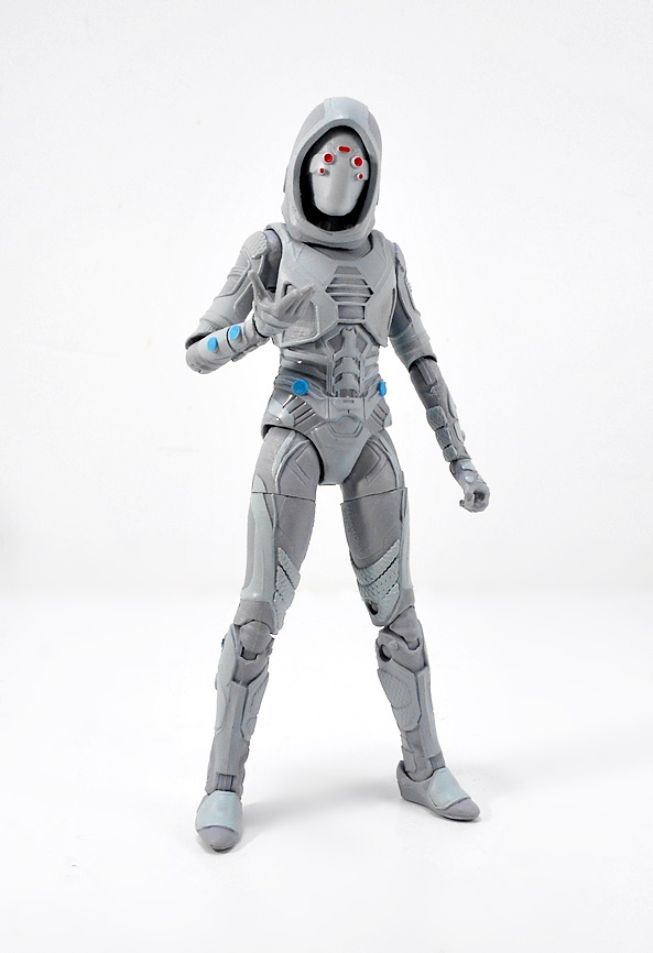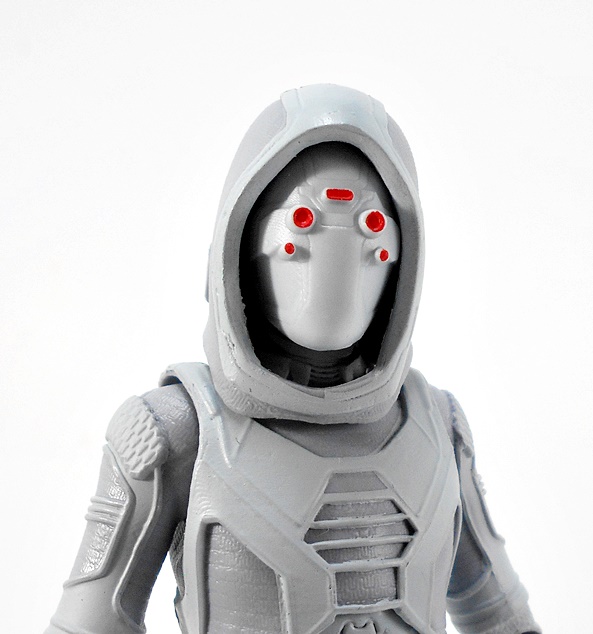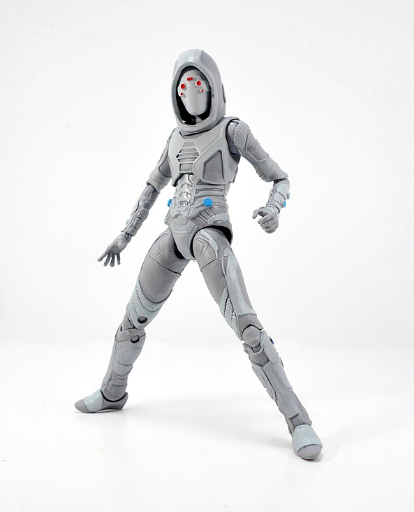 The masked head is a separate piece from the hood, allowing for it to articulate fairly well. The face mask is mostly featureless, except for the red “eyes” which pays homage to the comic version of Ghost. And like those blue points on the body, the red paint here stands out beautifully against the otherwise colorless figure.