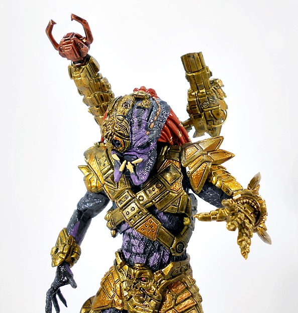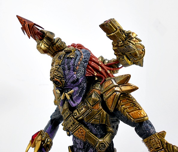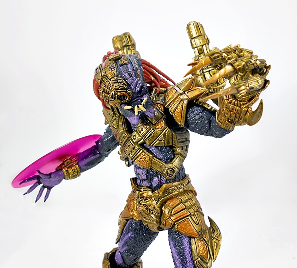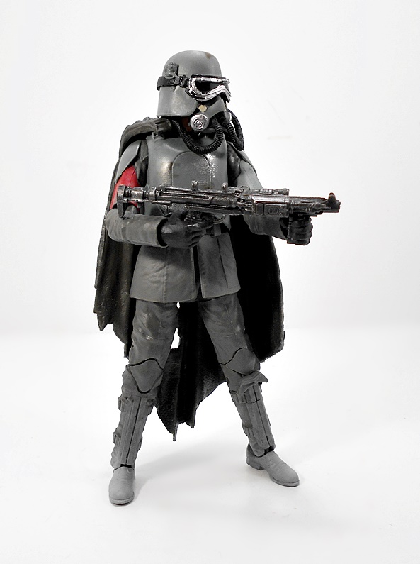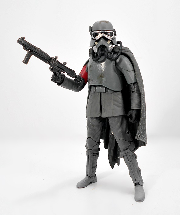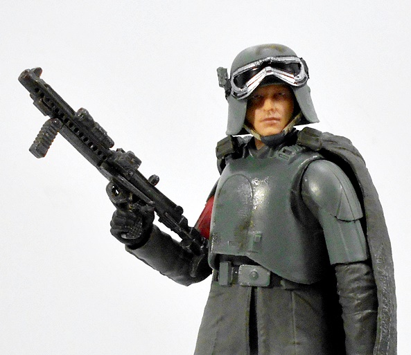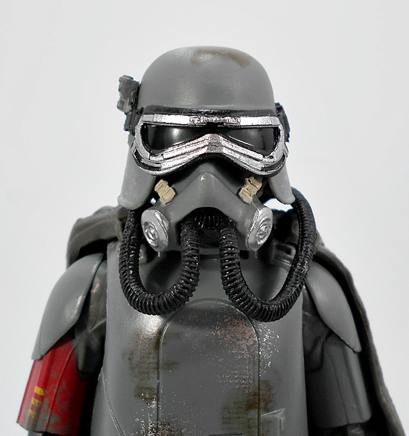The extra uniform pieces consist of a cape, a helmet, goggles, and a breather mask. The cape features some particularly great sculpting and weathering, and I like that it’s not too cumbersome, because even as it is, it seems like the most impractical thing to include on an infantry uniform. [OK, that was only true until I realized it’s probably a rain poncho and not a cape.] It’s designed to tab into two notches on his shoulders, but mine doesn’t like to do that, which isn’t a big problem because it stays on just fine by hugging his shoulders.