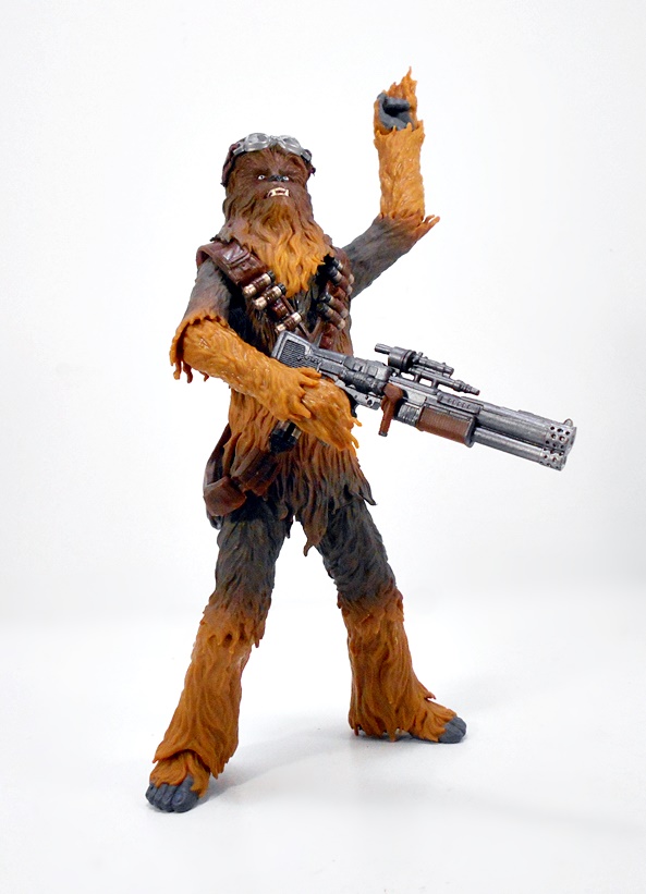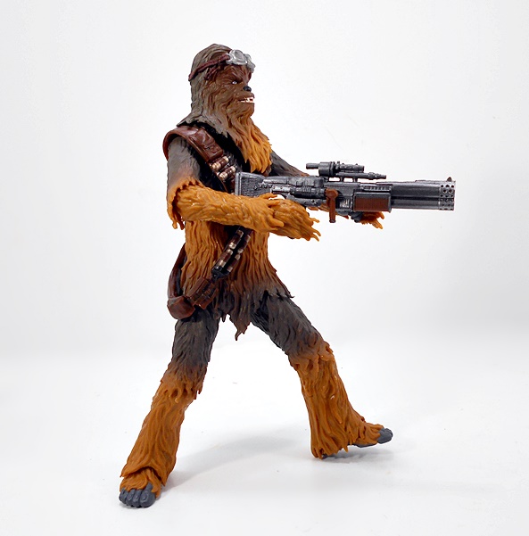 The final accessory in the box is Han’s E-10 blaster rifle. It’s a nice change-up form the usual Imperial small arms and features some great detail in the sculpt. The forearm grip is even folded down so it can be held in both hands. And since I’m looking at two figures today, I’m just going to skip the usual run-down of articulation. There’s nothing new here, and I’ll just say how I wish Black Series made use of double-hinged elbows like Marvel Legends does. The rotating hinges are OK, but I would really like a better range of motion in those elbows. Moving on to Chewbacca…