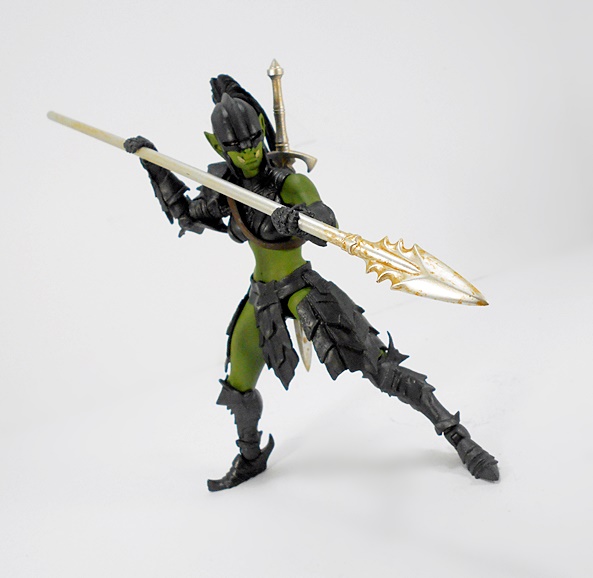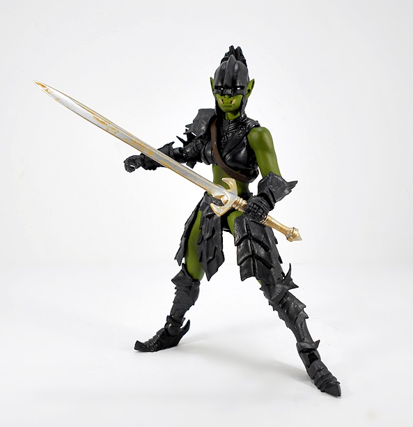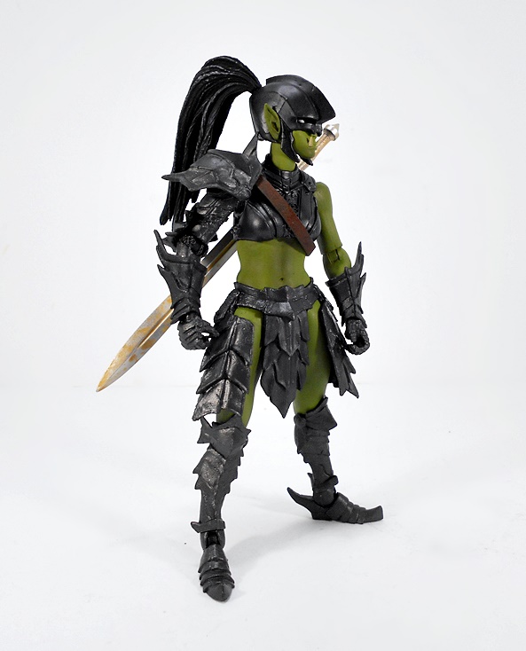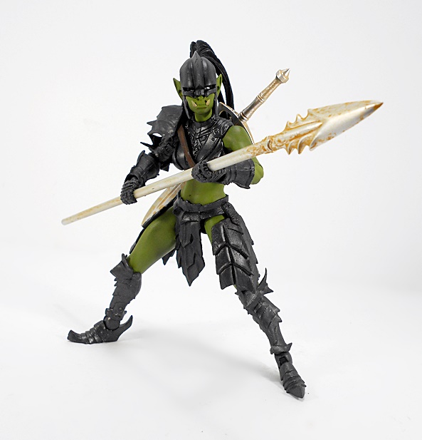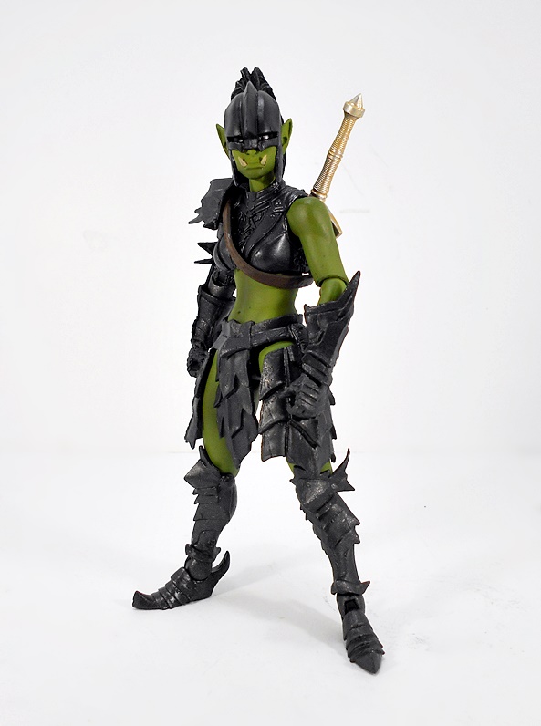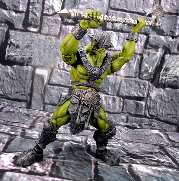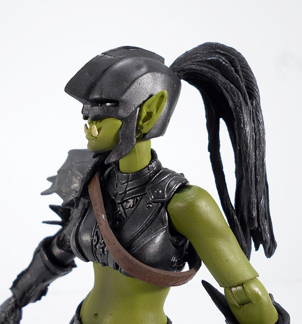 The new head sculpt also really helps to carry the figure as a troop builder. I don’t want to call it generic, because that sounds like an insult, but it certainly works as a faceless minion. The top half of the head is encased in a crude helmet with spikes coming off the ears. There’s some lovely cuts and scrapes integrated into the sculpt and the lower portion of the face that shows through is teeming with personality. You can just catch a hint of his squished nose and the broad mouth has a pair of tusk-like teeth protruding upward from each corner. Thankfully T4H didn’t spare the paint on the head, so you get a bit of a different shade of green for the cracked lips, and the tusks are painted as well.