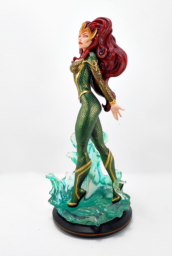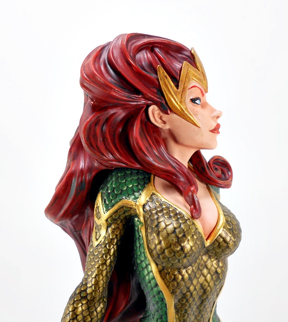 Moving on to the portrait, and oh boy do I get a major Filmation (as in He-Man/She-Ra) vibe off of this. I’m not sure if it’s from the eyes, but I saw it right away and can’t unsee it. It’s not a bad thing, mind you, just that I find the styles highly similar. Mera’s face is framed by a gold tiara, behind which flows her voluminous red hair. The sculptor really went over the top on her hair and it looks great. The painted facial features match the impecable quality of the rest of the piece. Her eyes are straight and even and the eyebrows and lips are crisp and sharp. No complaints here.