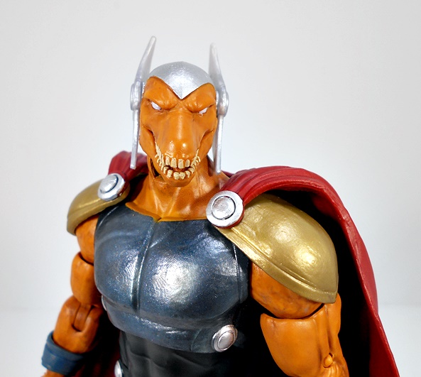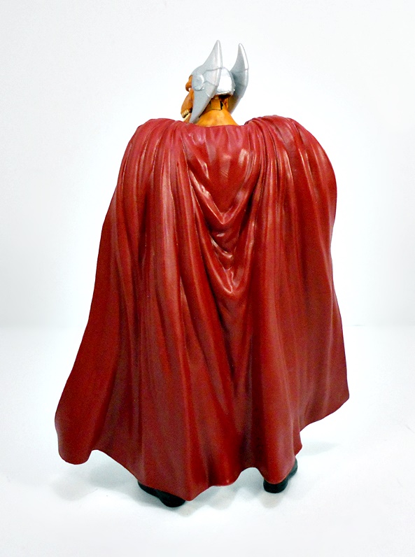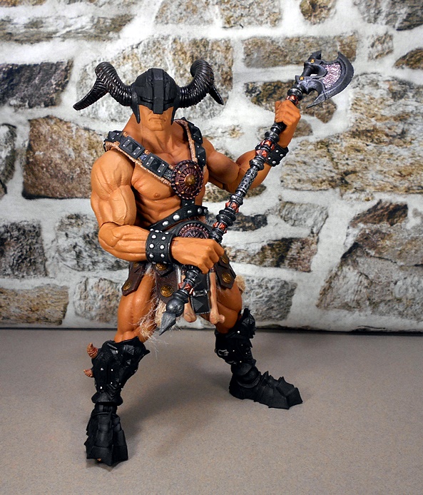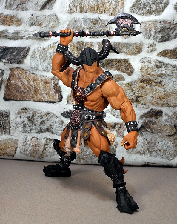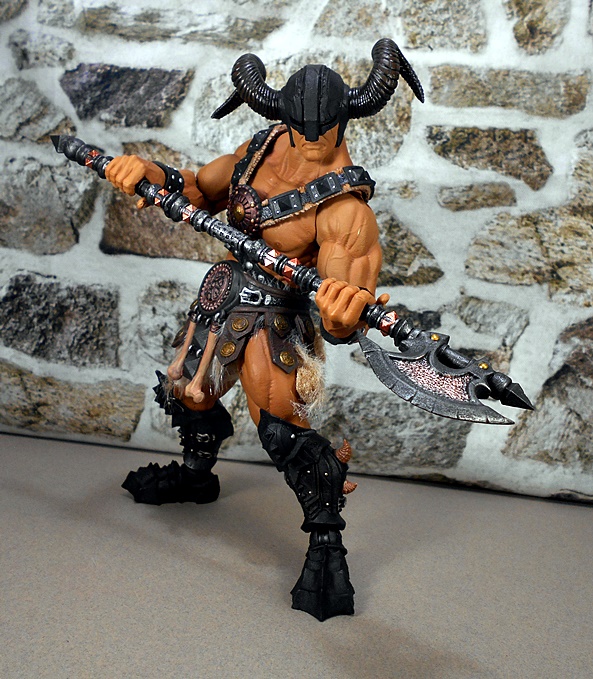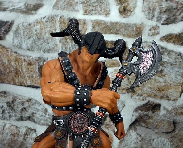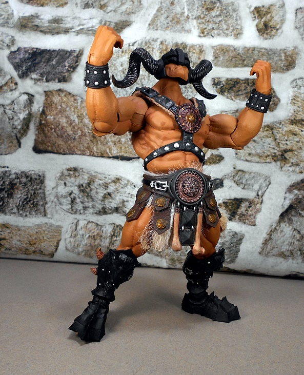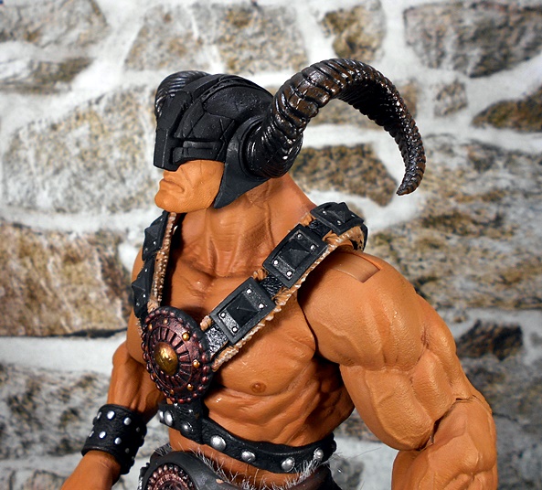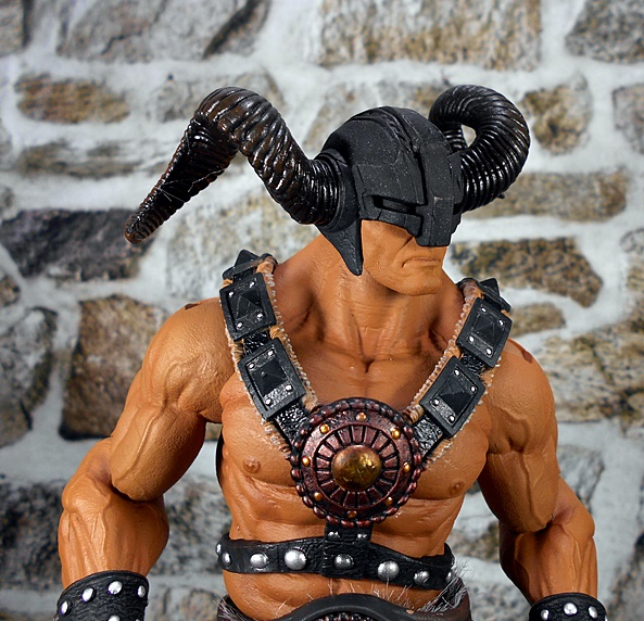The head sculpt is brand new, with Bolthar wearing a helmet that only exposes the lower half of his face. His human-like visage has a pronounced chin and chiseled features. His down-turned mouth makes him look like he’s determined to hit something with a tree. The helmet is painted and textured to resemble iron, with plenty of pitting and cracks incorporated into the sculpt, and he has black ram horns protruding from each side.