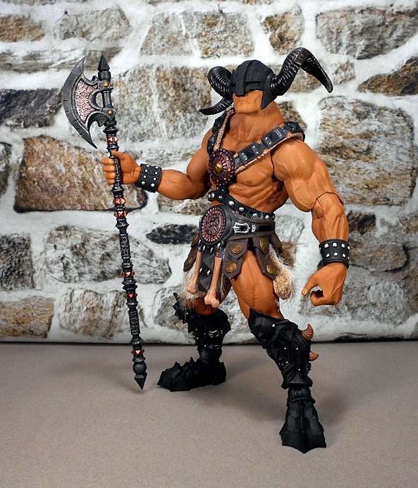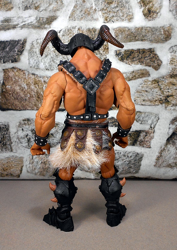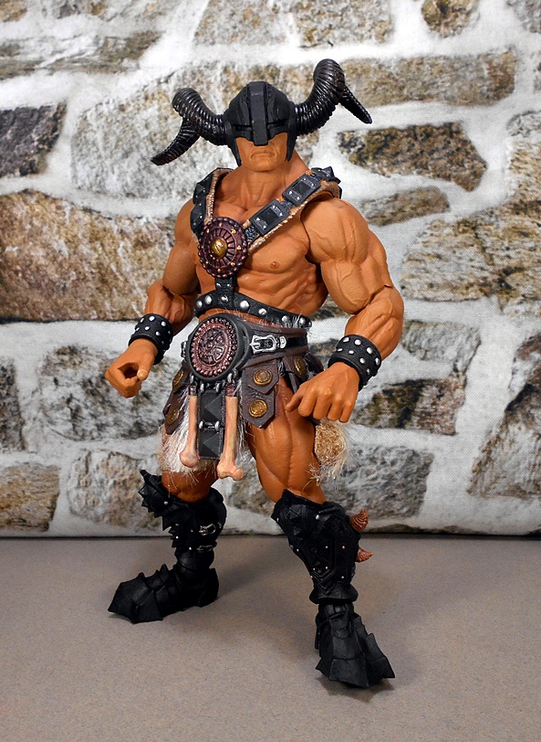 And so, I won’t go into too much detail with the sculpt, because I’ve covered it twice already, but I will say that it looks as amazing as ever with this new deco. The skin tone has been changed from Ogre green to a tanned human flesh, which still brings out all the muscles, sinew and veins that are in the sculpt. Bolthor’s outfit has a bit more of a bronze motif, and I’m still impressed by detail work in his harness. The plates on have individually sculpted and painted rivets, the straps have realistic leather texturing, and that elaborate belt remains a masterpiece. Each “leather” strap has a detailed bronze medallion, the bones look great, and the whole ensemble is worn above a furry barbarian diaper. Bolthor’s lower leg armor is colored the same as Kkurzog’s and still consists of the crude and jagged Orc-style armor with some kind of horns or teeth embedded in them. Unlike Kkurzog, who went barefoot, Bolthor has the heavy boots worn by the Ogre Legion Builder.