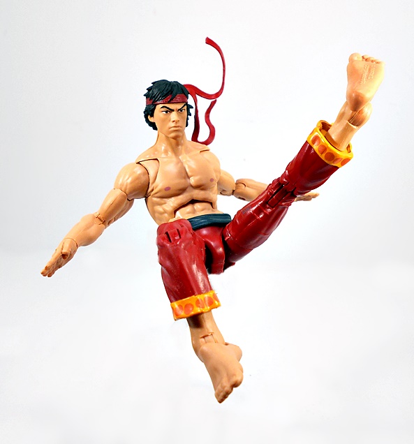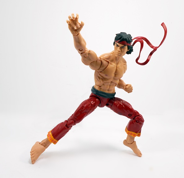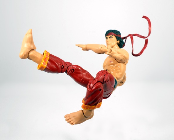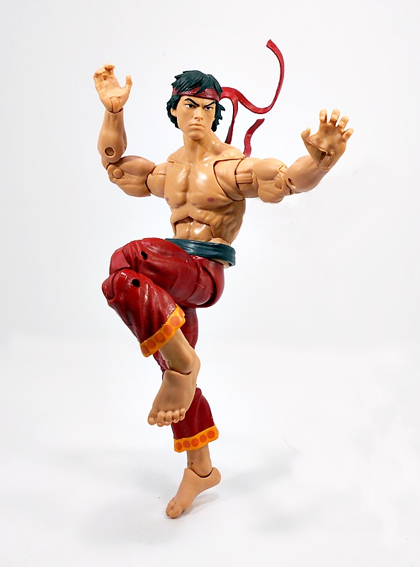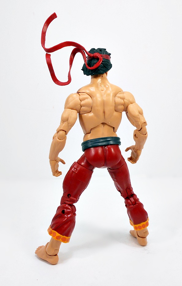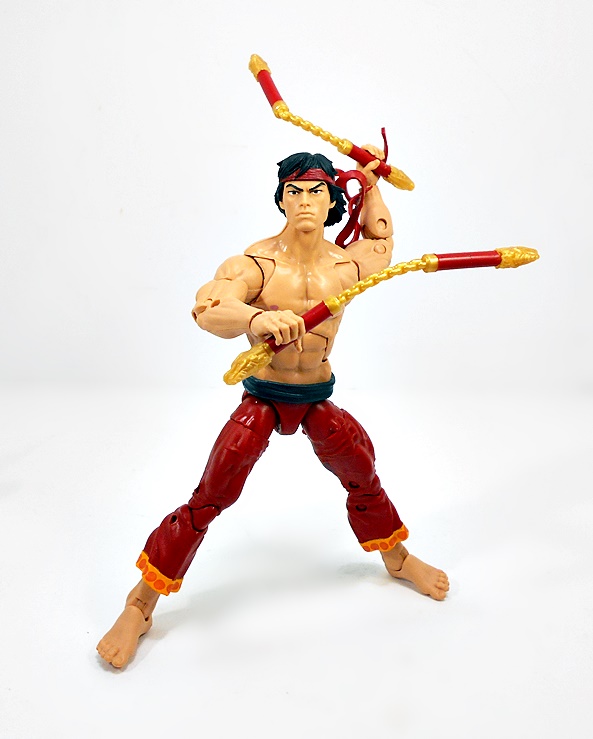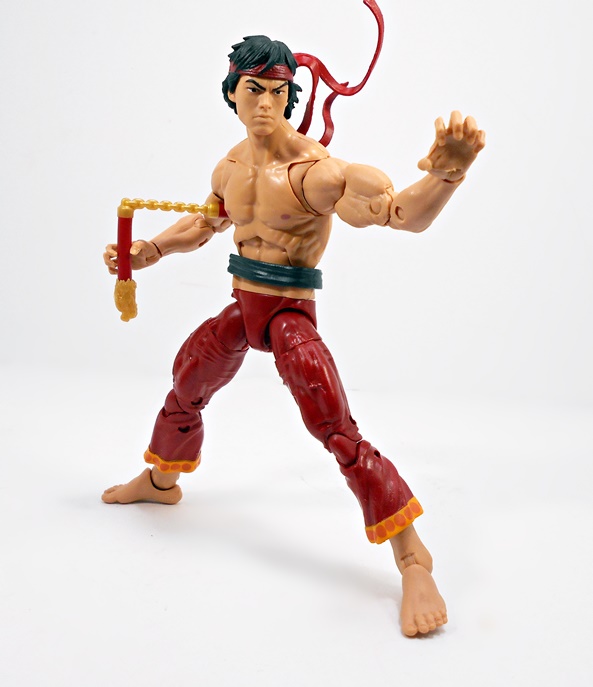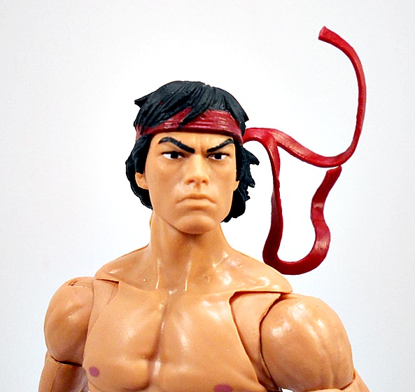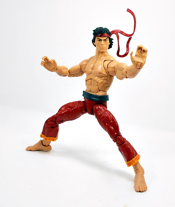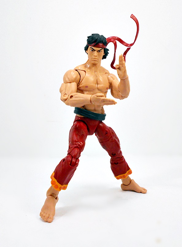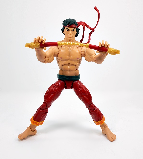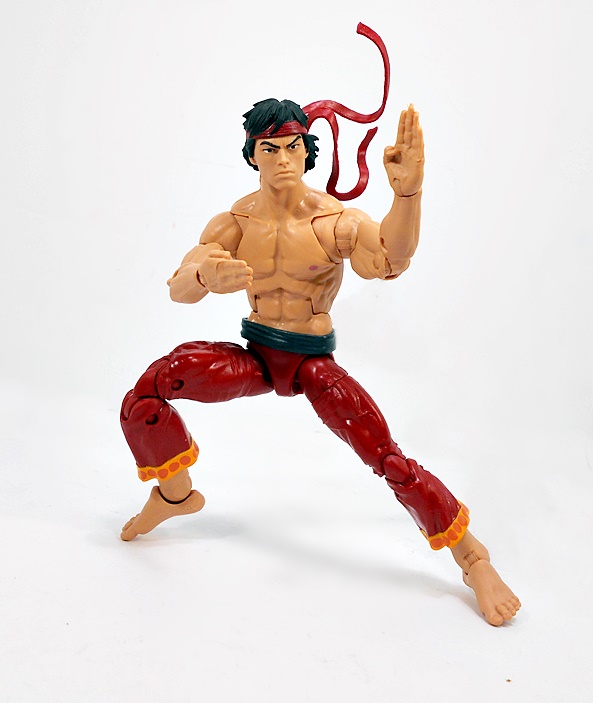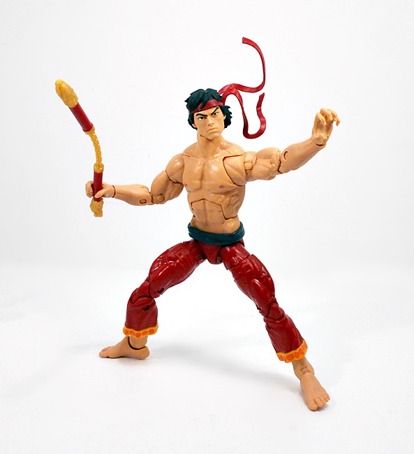 There’s certainly not a whole lot to say about his costume. Shang-Chi’s got a pair of red trousers with orange and yellow ankle cuffs, a black belt around his waist, and other than that he’s just showing a whole lot of skin and muscle. The coloring on the pants is nice, the sculpted muscles look great, His nipples awkwardly get by on paint alone, rather than sculpt, and I think those are newly sculpted feet, but I wonder why they lack peg holes. He’s undoubtedly a nice looking figure, but I tend to think more generic martial artist or maybe GI JOE, more than I think Marvel Comics. But that’s just my own ignorance talking. Either way, I think Hasbro’s got about 90% of their GI JOE Classified Quick Kick figure right here.