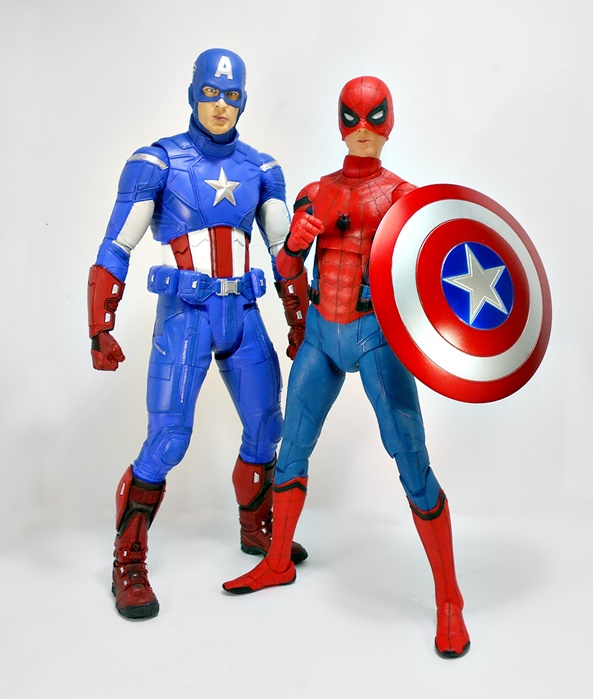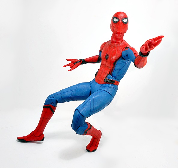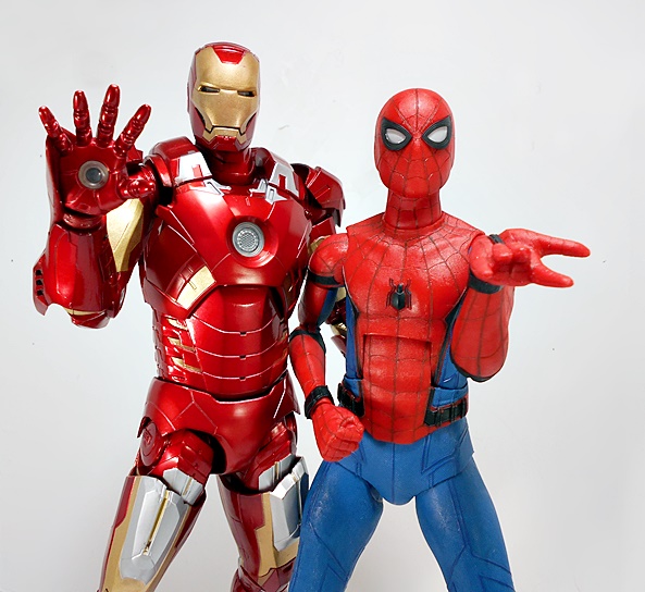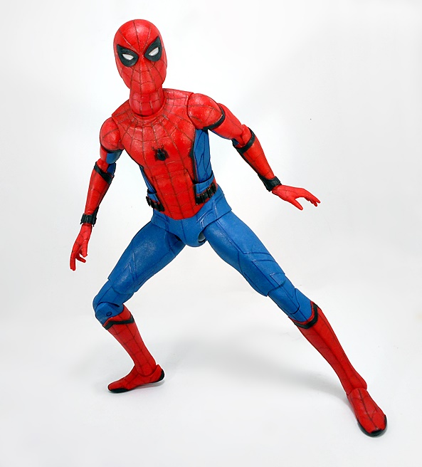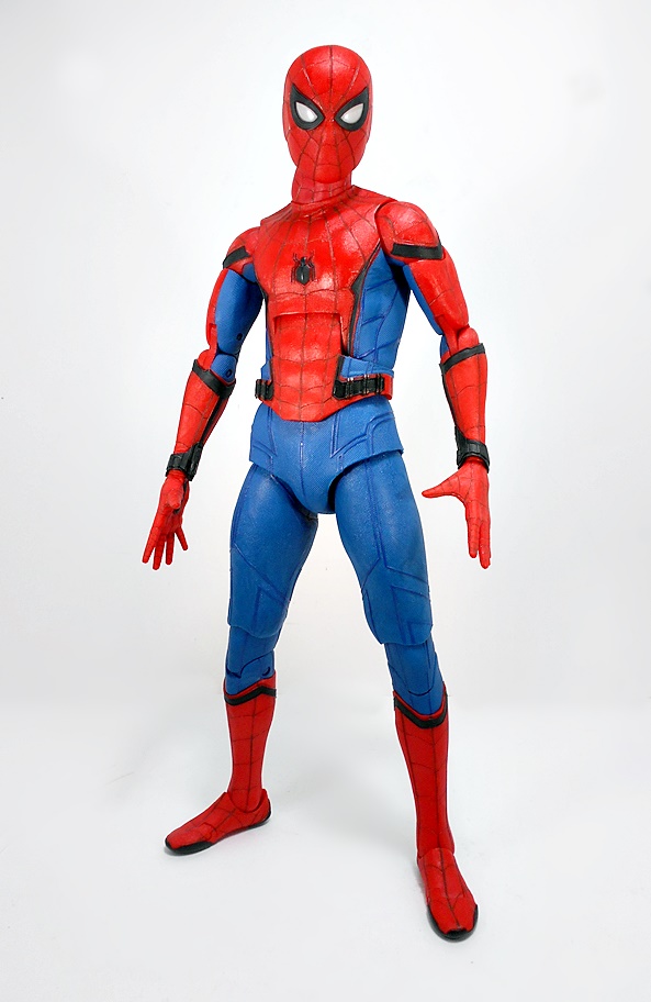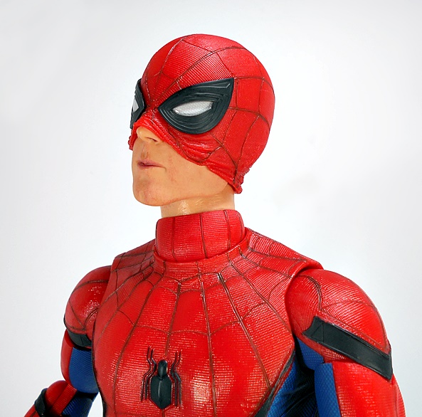 These figures come in huge window boxes with lots of colorful artwork on the panels. They show off the figure very well, so if you’re buying one at a brick-and-mortar store you can really scrutinize the paint on the one your selecting. The packaging also does a great job of concealing the extras, which are trapped under a bubble inside the side panels of the inner tray. These are also the only aspect of the box that’s not collector friendly, but if you tear up the sides to get at them, it really doesn’t show and the figure will still display just fine in the box with the extra pieces rattling around on the bottom. And just to put the size of these Quarter-Scale figures into proper perspective, here’s a quick shot of this figure beside Hasbro’s 6-inch Marvel Legends Homecoming Spider-Man figure.
